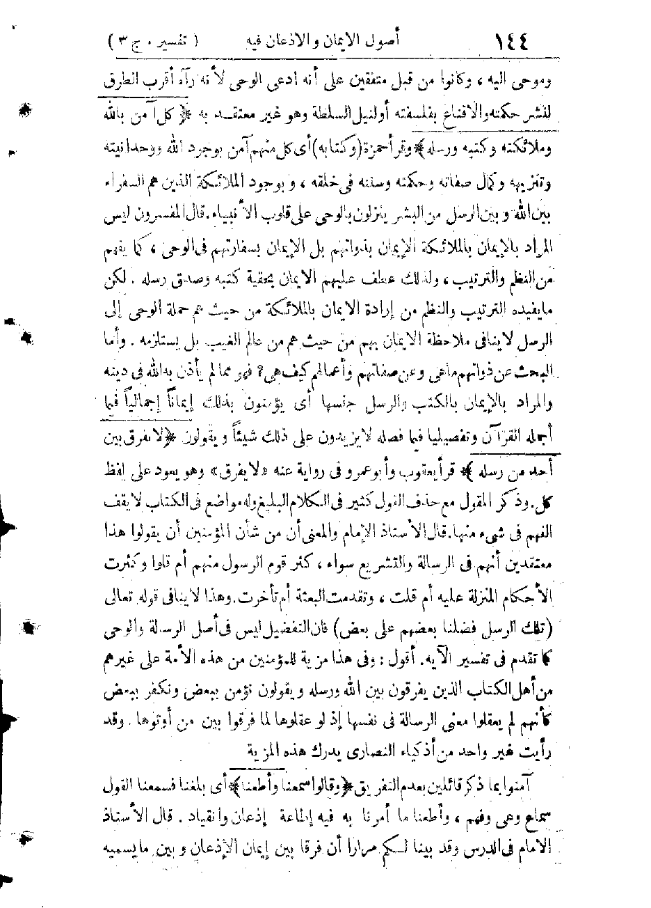 السَّابِعَةُ: (سُورَةُ الْكَهْفِ 18) وَفِيهَا قَوْلُهُ - تَعَالَى - حِكَايَةً عَنِ الْعَبْدِ الَّذِي أَتَاهُ اللهُ رَحْمَةً وَعِلْمًا مِنْ لَدُنْهُ فِي خِطَابِ مُوسَى: سَأُنَبِّئُكَ بِتَأْوِيلِ مَا لَمْ تَسْتَطِعْ عَلَيْهِ صَبْرًا [18: 78] وَقَوْلُهُ بَعْدَ أَنْ نَبَّأَهُ بِمَا تَئُولُ إِلَيْهِ تِلْكَ الْأَعْمَالُ الَّتِي أَنْكَرَهَا مُوسَى: ذَلِكَ تَأْوِيلُ مَا لَمْ تَسْطِعْ عَلَيْهِ صَبْرًا [18: 82] فَالْإِنْبَاءُ بِالتَّأْوِيلِ إِنْبَاءٌ بِأُمُورٍ عَمَلِيَّةٍ سَتَقَعُ فِي الْمَآلِ لَا بِالْأَقْوَالِ، فَتَبَيَّنَ مِنْ هَذِهِ الْآيَاتِ أَنَّ لَفْظَ التَّأْوِيلِ لَمْ يَرِدْ فِي الْقُرْآنِ إِلَّا بِمَعْنَى الْأَمْرِ الْعَمَلِيِّ الَّذِي يَقَعُ فِي الْمَآلِ تَصْدِيقًا لِخَبَرٍ أَوْ رُؤْيَا أَوْ لِعَمَلٍ غَامِضٍ يُقْصَدُ بِهِ شَيْءٌ فِي الْمُسْتَقْبَلِ، فَيَجِبُ أَنْ تُفَسَّرَ آيَةُ آلِ عِمْرَانَ بِذَلِكَ، وَلَا يَجُوزُ أَنْ يُحْمَلَ التَّأْوِيلُ فِيهَا عَلَى الْمَعْنَى الَّذِي اصْطَلَحَ عَلَيْهِ قُدَمَاءُ الْمُفَسِّرِينَ وَهُوَ جَعْلُهُ بِمَعْنَى التَّفْسِيرِ كَمَا يَقُولُ ابْنُ جَرِيرٍ: الْقَوْلُ فِي تَأْوِيلِ هَذِهِ الْآيَةِ كَذَا، وَلَا عَلَى مَا اصْطَلَحَ عَلَيْهِ مُتَأَخِّرُوهُمْ مِنْ جَعْلِ التَّأْوِيلِ عِبَارَةً عَنْ نَقْلِ الْكَلَامِ عَنْ وَضْعِهِ إِلَى مَا يَحْتَاجُ فِي إِثْبَاتِهِ إِلَى دَلِيلٍ لَوْلَاهُ مَا تُرِكَ ظَاهِرُ اللَّفْظِ وَمِثْلُهُ قَوْلُ أَهْلِ الْأُصُولِ: التَّأْوِيلُ صَرْفُ اللَّفْظِ عَنِ الِاحْتِمَالِ الرَّاجِحِ إِلَى الِاحْتِمَالِ الْمَرْجُوحِ لِدَلِيلٍ.