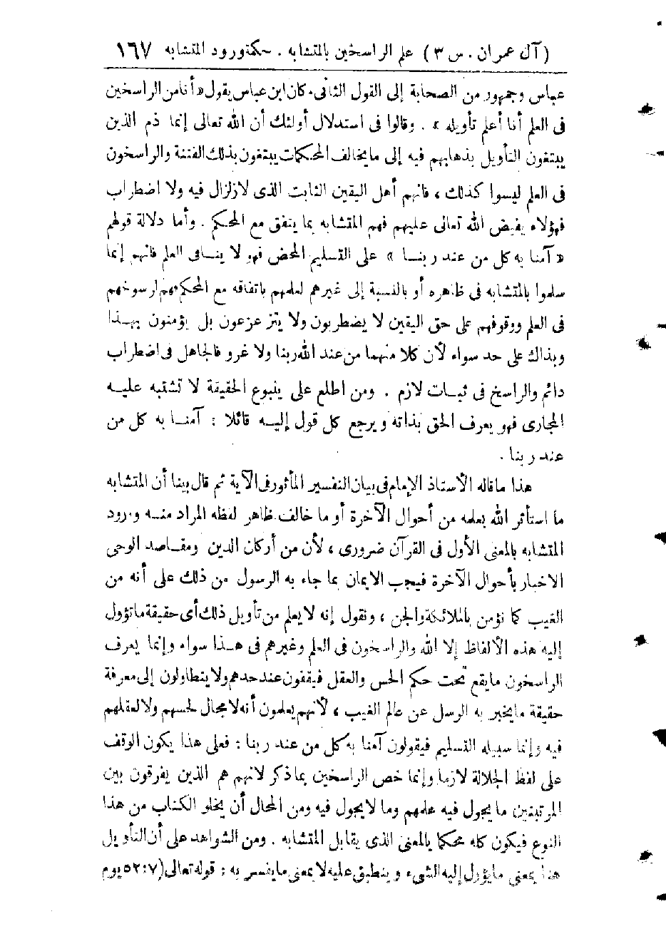 صِفَةً زَائِدَةً. وَالسَّلَفُ الْأَثَرِيُّونَ يَقُولُونَ: لَا نُفَرِّقُ بَيْنَ صِفَاتِ اللهِ - تَعَالَى - الَّذِي أَثْبَتَهَا لِنَفْسِهِ فِي كِتَابِهِ وَعَلَى لِسَانِ رَسُولِهِ. وَإِنَّمَا هَذَا خِلَافٌ فِي التَّنْزِيهِ وَفِي كَوْنِ كُلِّ مَا جَاءَ عَنِ اللهِ فِي ذَلِكَ حَقٌّ، وَلَوْلَا أَنَّ الْمُسْلِمِينَ انْقَسَمُوا إِلَى مَذَاهِبَ عَنَى أَهْلُ كُلِّ مَذْهَبٍ مِنْهَا بِإِثْبَاتِ مَذْهَبِهِمْ وَتَأْيِيدِهِ وَإِبْطَالِ مُخَالِفِهِ وَتَفْنِيدِهِ لَزَالَ هَذَا الْخِلَافُ وَعَرَفَ الْأَكْثَرُونَ الْحَقَّ صُورَةً وَمَعْنًى حَتَّى لَا يُشَنِّعَ أَشْعَرِيٌّ عَلَى حَنْبَلِيٍّ وَلَا أَثَرِيٌّ عَلَى نَظَرِيٍّ ; وَلِذَلِكَ تَرَى مُحَقِّقِي الْمُتَكَلِّمِينَ رَجَعُوا فِي آخِرِ عَهْدِهِمْ إِلَى مَذْهَبِ السَّلَفِ. وَبِذَلِكَ صَرَّحَ الشَّيْخُ أَبُو الْحَسَنِ الْأَشْعَرِيُّ فِي (الْإِبَانَةِ) وَأَبُو حَامِدٍ الْغَزَالِيُّ فِي (إِلْجَامِ الْعَوَامِّ عَنْ عِلْمِ الْكَلَامِ) وَغَيْرِهِ مِنْ كُتُبِهِ الَّتِي أَلَّفَهَا فِي آخِرِ حَيَاتِهِ.