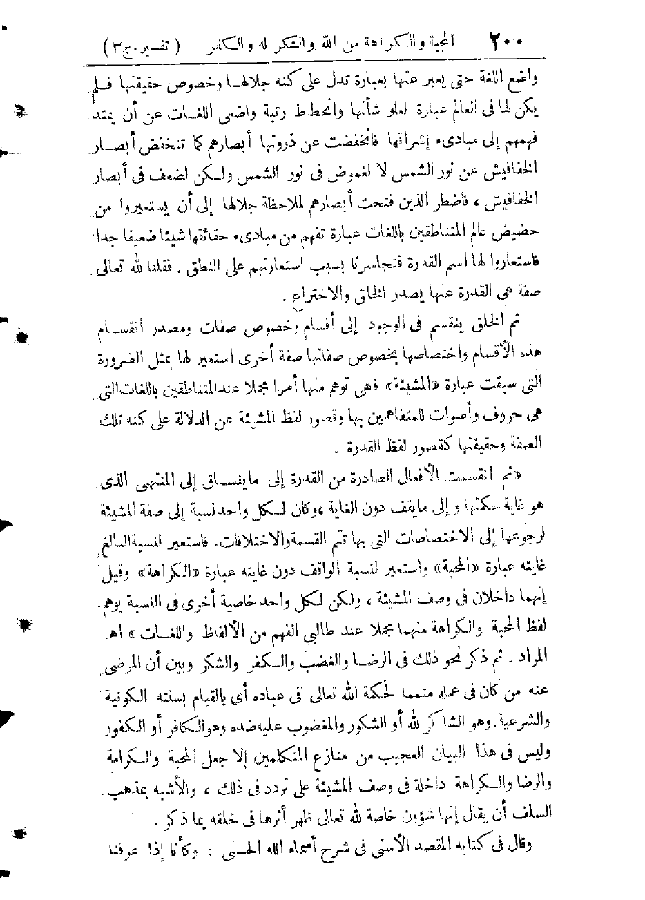 لِأَنَّ الْكَلَامَ فِي طَبِيعَةِ الْحُبِّ لَا فِي الِاشْتِغَالِ وَالْفِتْنَةِ بِهِ خَاصٌّ، وَحُبُّ النِّسَاءِ وَالْبَنِينَ مَقْصِدٌ، وَحُبُّ الْمَالِ وَسِيلَةٌ لَا يَجْعَلُهُ مَقْصِدًا إِلَّا مَنْ أَعْمَتْهُ الْفِتْنَةُ عَنِ الْحَقِيقَةِ. وَلَوْ أَرَدْنَا أَنْ نَخُوضَ فِي شَرْحِ فِتْنَةِ النَّاسِ بِالْمَالِ وَكَيْفَ تَشْغَلُهُمْ عَنْ حُقُوقِ اللهِ وَحُقُوقِ الْأُمَّةِ وَالْوَطَنِ وَحُقُوقِ مَنْ يُعَامِلُهُمْ، بَلْ وَعَنْ حُقُوقِ بُيُوتِهِمْ وَعِيَالِهِمْ، بَلْ وَعَنْ حُقُوقِ أَنْفُسِهِمْ عَلَى أَنْفُسِهِمْ بِمَا يُثْلِمُونَ شَرَفَهُمْ أَوْ يُقَصِّرُونَ فِي النَّفَقَةِ الَّتِي تَلِيقُ بِهِمْ لَأَطَلْنَا وَخَرَجْنَا عَنْ حَدِّ الْوُقُوفِ عِنْدَ بَيَانِ كَوْنِ الْمَالِ مِنْ مَتَاعِ الْحَيَاةِ الدُّنْيَا بِمِقْدَارِ مَا نَفْهَمُ الْعِبْرَةَ مِنَ الْآيِ، وَنَكُونُ قَدْ جَعَلْنَا الْكَلَامَ فِي الْمَالِ مَقْصِدًا كَمَا جَعَلَهُ الْأَشِحَّةُ مِنَ الْأَغْنِيَاءِ مَقْصِدًا، أَمَّا لَفْظُ " الْقِنْطَارِ " فَمَعْنَاهُ الْعُقْدَةُ الْمُحْكَمَةُ مِنَ الْمَالِ، وَهُوَ مَا يُعَبِّرُ عَنْهُ التُّجَّارُ الْآنَ بِالصَّرِّ أَوِ الصُّرَّةِ. هَذَا هُوَ الْأَصْلُ فِيهِ عِنْدِي وَسَائِرُ الْأَقْوَالِ فِي مَعْنَاهُ تَرْجِعُ إِلَيْهِ، فَمِنْهَا أَنَّهُ الْمَالُ الْكَثِيرُ بَعْضُهُ عَلَى بَعْضٍ، وَمِنْهَا أَنَّهُ وَزْنُ اثْنَتَيْ عَشْرَةَ أَلْفَ أُوقِيَّةٍ. وَرُوِيَ مَرْفُوعًا