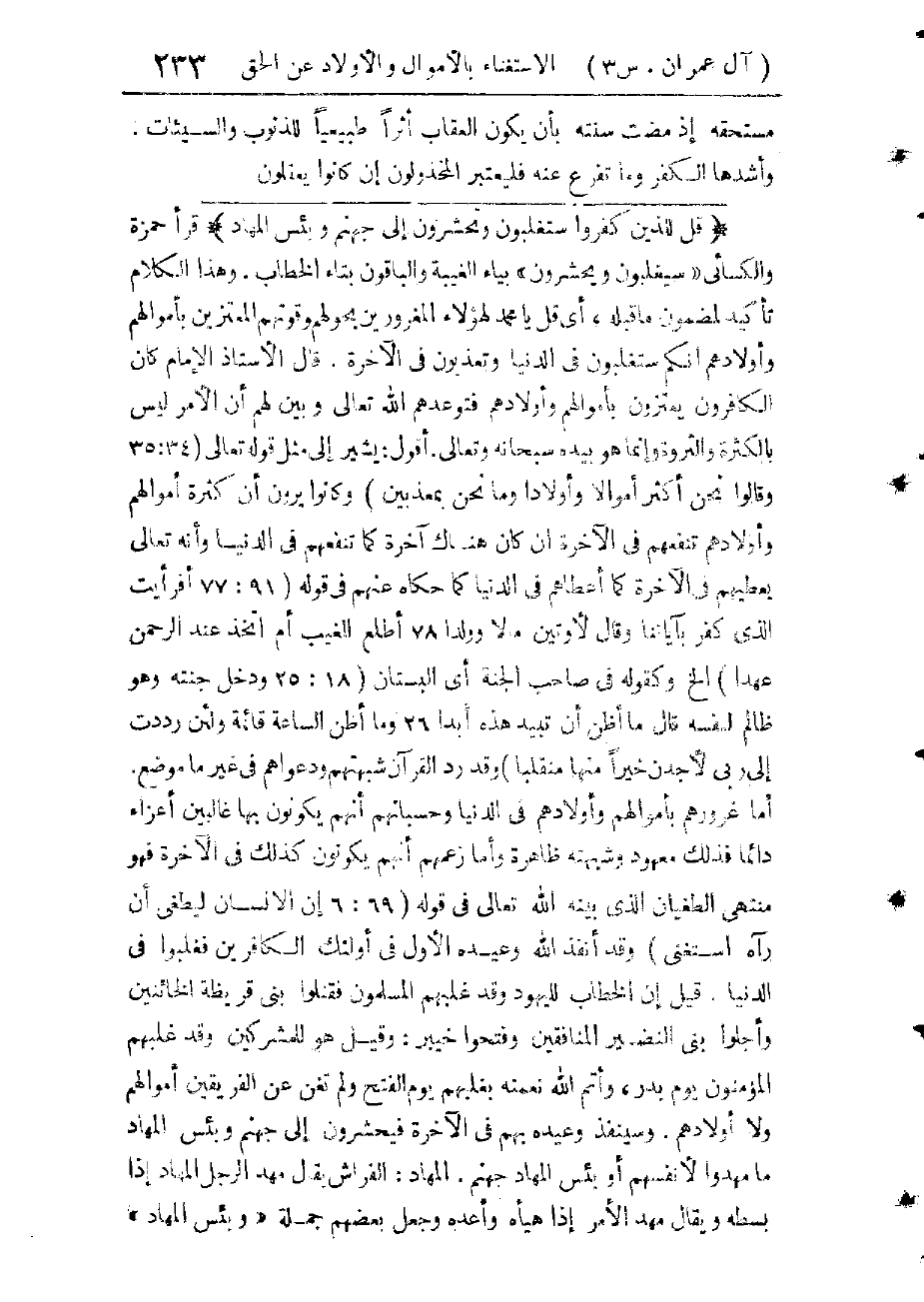 وَمِنْ مَبَاحِثِ اللَّفْظِ فِي الْآيَةِ: دُخُولُ الْحَرْفِ الْمَصْدَرِيِّ عَلَى مِثْلِهِ فِي قَوْلِهِ - تَعَالَى -: (لَوْ أَنَّ) قَالَ الْأُسْتَاذُ الْإِمَامُ: وَهُوَ مَعْرُوفٌ فِي الْكَلَامِ الْعَرَبِيِّ الْفَصِيحِ، فَلَا حَاجَةَ إِلَى جَعْلِ الْأَصْلِ فِيهِ الْمَنْعَ وَتَأْوِيلَ مَا سُمِعَ مِنْهُ. وَقَدِ اخْتُلِفَ فِي تَفْسِيرِ الْأَمَدِ فَقِيلَ: الْغَايَةُ، وَقِيلَ: الْأَجَلُ، وَقِيلَ: الْمَكَانُ. وَقَالَ الرَّاغِبُ: الْأَمَدُ وَالْأَبَدُ يَتَقَارَبَانِ، لَكِنَّ الْأَبَدَ عِبَارَةٌ عَنْ مُدَّةٍ مِنَ الزَّمَانِ لَيْسَ لَهَا حَدٌّ مَحْدُودٌ وَلَا يَتَقَيَّدُ، لَا يُقَالُ: أَبَدَ كَذَا، وَالْأَمَدُ مُدَّةٌ لَهَا حَدٌّ مَجْهُولٌ إِذَا أُطْلِقَ وَقَدْ يَنْحَصِرُ نَحْوَ أَنْ يُقَالَ: أَمَدُ كَذَا كَمَا يُقَالُ: زَمَانُ كَذَا. وَالْفَرْقُ بَيْنَ الزَّمَانِ وَالْأَمَدِ أَنَّ الْأَمَدَ يُقَالُ بِاعْتِبَارِ الْغَايَةِ، وَالزَّمَانُ