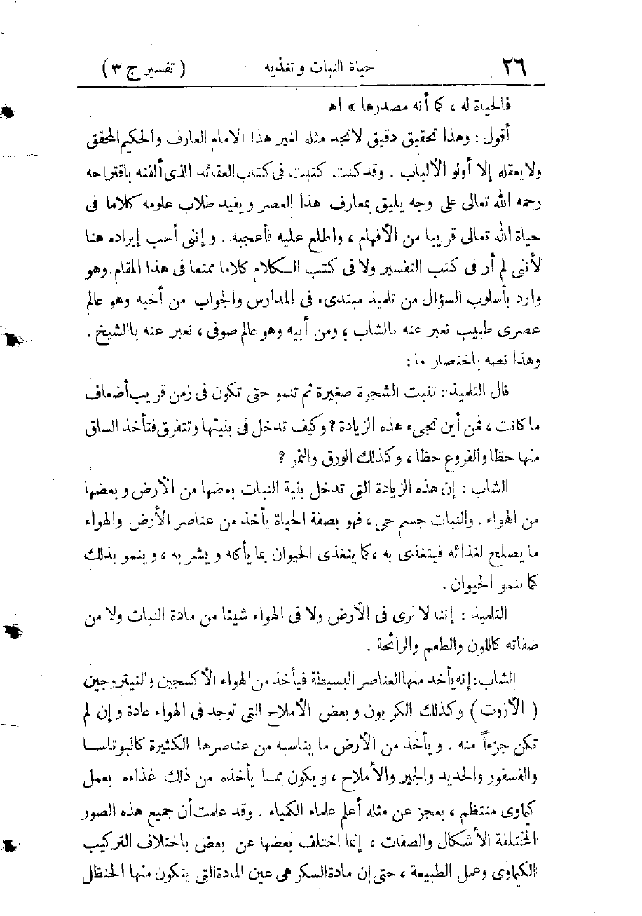 أَقُولُ: وَيَظْهَرُ هَذَا عَلَى رَأْيِ الْمُتَأَخِّرِينَ فِي سَبَبِ النَّوْمِ أَكْمَلَ الظُّهُورِ وَإِنْ كَانَ بَدِيهِيًّا فِي نَفْسِهِ، فَإِنَّهُمْ يَقُولُونَ: إِنَّ النَّوْمَ عِبَارَةٌ عَنْ بُطْلَانِ عَمَلِ الْمُخِّ بِسَبَبِ مَا تُوَلِّدُهُ الْحَرَكَةُ مِنَ السُّمُومِ الْغَازِيَّةِ الْمُؤَثِّرَةِ فِي الْعَصَبِ، وَقِيلَ: بِسَبَبِ مَا تُفْرِزُهُ الْحُوَيْصِلَاتُ الْعَصَبِيَّةُ مِنَ الْمَاءِ الْكَثِيرِ بِالْفِعْلِ الْكِيمَاوِيِّ وَقْتَ الْعَمَلِ، فَكَثْرَةُ هَذَا الْمَاءِ تُضْعِفُ قَابِلِيَّةَ التَّأَثُّرِ فِيهَا فَتُحْدِثُ فِيهَا الْفُتُورَ فَيَكُونُ النَّوْمُ، وَيَسْتَمِرُّ إِلَى أَنْ يَتَبَخَّرَ ذَلِكَ الْمَاءُ، وَعِنْدَ ذَلِكَ تَتَنَبَّهُ الْأَعْصَابُ وَيَرْجِعُ إِلَيْهَا تَأَثُّرُهَا وَإِدْرَاكُهَا، فَسَبَبُ النَّوْمِ أَمْرٌ جُسْمَانِيٌّ مَحْضٌ، وَاللهُ - تَعَالَى - مُنَزَّهٌ عَنْ صِفَاتِ الْأَجْسَامِ وَعَوَارِضِهَا.