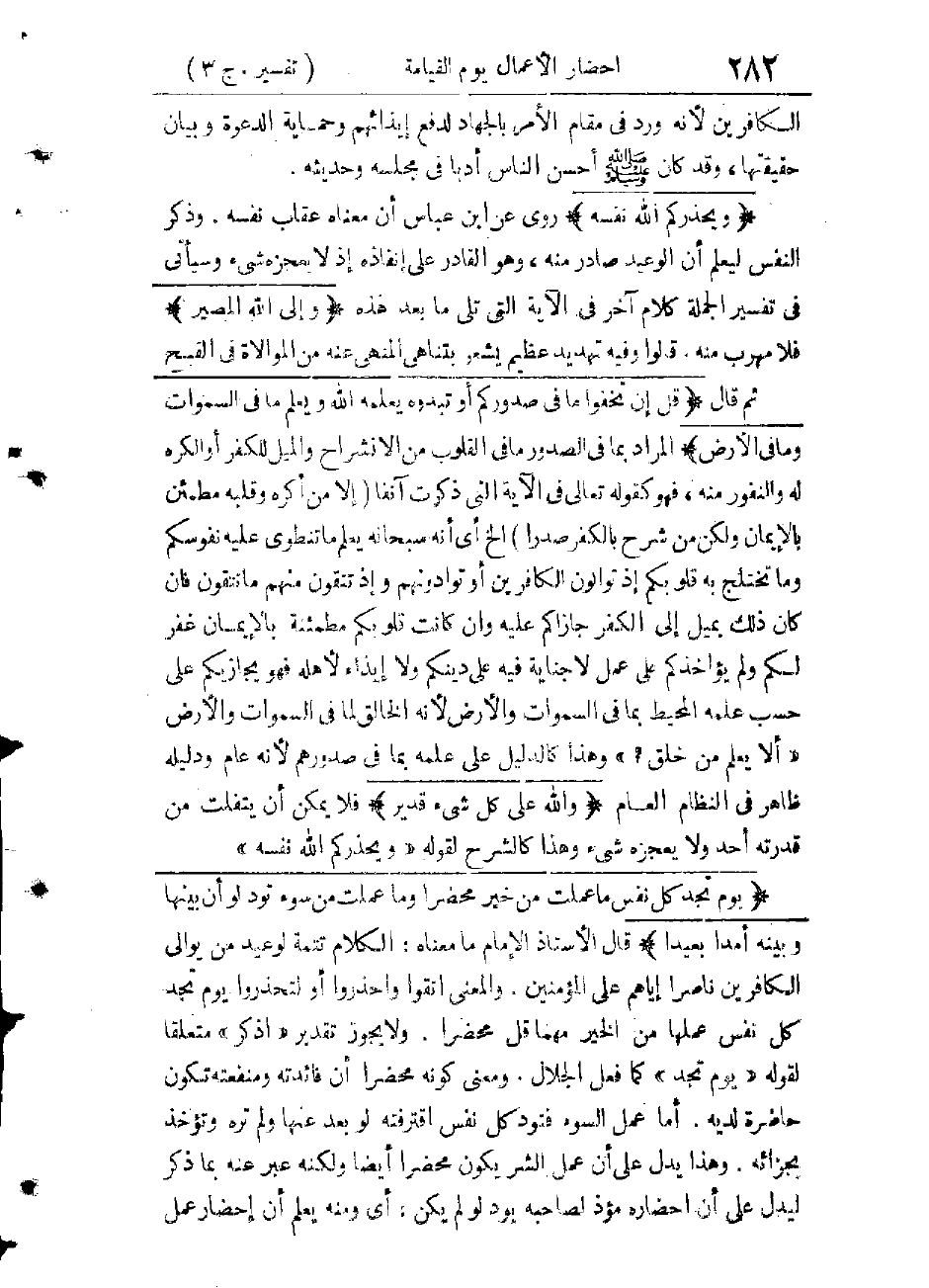 عَلَى عَمَلٍ لَهُ صَالِحٍ، أَوْ لَا يُطَهِّرُهُ مِنْ ذُنُوبِهِ بِالْعَفْوِ وَالْمَغْفِرَةِ وَلَهُ عَذَابٌ أَلِيمٌ؟ لَمْ يَكْتَفِ - تَعَالَى - بِحِرْمَانِ بَائِعِي الْعَهْدِ بِالثَّمَنِ مِنَ النَّعِيمِ وَبِمَا أَعَدَّ لَهُمْ مِنَ الْعَذَابِ الْأَلِيمِ حَتَّى بَيَّنَ مَعَ ذَلِكَ أَنَّهُمْ يَكُونُونَ فِي دَرَكَةٍ مِنَ الْغَضَبِ الْإِلَهِيِّ لَا تُرْجَى لَهُمْ فِيهَا رَحْمَةٌ وَلَا يَسْمَعُونَ مِنْهُ - تَعَالَى - كَلِمَةَ عَفْوٍ وَلَا مَغْفِرَةٍ، فَعَدَمُ النَّظَرِ وَالْكَلَامِ كِنَايَةٌ عَنْ عَدَمِ الِاعْتِدَادِ وَمُنْتَهَى الْغَضَبِ الَّذِي لَا رَجَاءَ مَعَهُ وَلَا أَمَلَ.