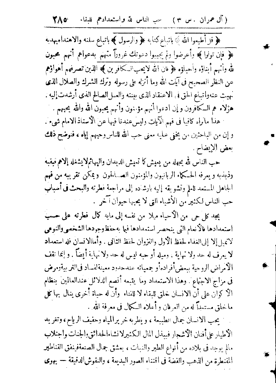 النَّفْسُ فِيهَا مَذَاهِبَ التَّأْوِيلِ، فَالْعَمَلُ هُوَ الَّذِي يُقَرِّرُ الْحَقَّ فِيهَا. وَقَدْ تَقَدَّمَ عَنْهُ تَفْسِيرُ الْحِكْمَةِ بِفِقْهِ الْكِتَابِ وَمَعْرِفَةِ أَسْرَارِهِ وَأَنَّ ذَلِكَ يَسْتَلْزِمُ الْعَمَلَ بِهِ، وَإِنَّمَا قَالَ: وَالنُّبُوَّةَ بَعْدَ قَوْلِهِ: يُؤْتِيَهُ اللهُ الْكِتَابَ لِأَنَّ الْمُرْسَلَ إِلَيْهِمْ يُقَالُ إِنَّهُمْ أُوتُوا الْكِتَابَ ثُمَّ يَقُولَ لِلنَّاسِ كُونُوا عِبَادًا لِي الْعِبَادُ جَمْعُ عَبْدٍ بِمَعْنَى عَابِدٍ، وَالْعَبِيدُ جَمْعٌ لَهُ بِمَعْنَى مَمْلُوكٍ أَيْ بِأَنْ تَتَّخِذُونِي إِلَهًا أَوْ رَبًّا لَكُمْ مِنْ دُونِ اللهِ أَيْ كَائِنِينَ لِي مِنْ دُونِ اللهِ أَوْ كُونُوا عَابِدِينَ لِي مِنْ دُونِهِ، وَقِيلَ مَعْنَاهُ حَالَ كَوْنِكُمْ مُتَجَاوِزِينَ اللهَ - تَعَالَى - أَيْ مُتَجَاوِزِينَ مَا يَجِبُ مِنْ إِفْرَادِهِ بِالْعِبَادَةِ وَتَخْصِيصِهِ بِالْعُبُودِيَّةِ. وَقَطَعَ أَبُو السُّعُودِ بِأَنَّ ذَلِكَ يَصْدُقُ بِعِبَادَةِ غَيْرِهِ اسْتِقْلَالًا أَوِ اشْتِرَاكًا. وَلَهُ عِنْدِي وَجْهَانِ: