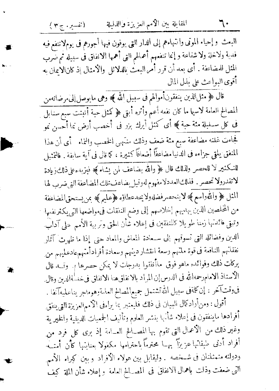 أَقُولُ: حَثَّتِ الْآيَاتُ السَّابِقَةُ عَلَى الصَّدَقَةِ وَالْإِنْفَاقِ فِي سَبِيلِ اللهِ أَبْلَغَ حَثٍّ وَآكِدَهُ، وَأَرْشَدَتْ إِلَى مَا يَجِبُ أَنْ يَتَّصِفَ بِهِ الْمُنْفِقُ عِنْدَ الْبَذْلِ مِنَ الْإِخْلَاصِ وَقَصْدِ تَثْبِيتِ النَّفْسِ، وَمَا يَجِبُ أَنْ يَتَّقِيَهُ بَعْدَ الْبَذْلِ وَهُوَ الْمَنُّ وَالْأَذَى، فَكَانَ ذَلِكَ إِرْشَادًا يَتَعَلَّقُ بِالْبَذْلِ وَالْبَاذِلِ، ثُمَّ أَرَادَ - تَعَالَى - أَنَّ يُبَيِّنَ لَنَا مَا يَنْبَغِي مُرَاعَاتُهُ فِي الْمَبْذُولِ لِيُكْمِلَ الْإِرْشَادَ فِي هَذَا الْمَقَامِ فَقَالَ: يَا أَيُّهَا الَّذِينَ آمَنُوا أَنْفِقُوا مِنْ طَيِّبَاتِ مَا كَسَبْتُمْ وَمِمَّا أَخْرَجْنَا لَكُمْ مِنَ الْأَرْضِ فَبَيَّنَ نَوْعَ مَا يُبْذَلُ وَمَا يُنْفَقُ وَوَصَفَهُ، أَمَّا الْوَصْفُ فَهُوَ أَنْ يَكُونَ مِنَ الطَّيِّبَاتِ، وَالطَّيِّبُ هُوَ الْجَيِّدُ الْمُسْتَطَابُ وَضِدُّهُ الْخَبِيثُ الْمُسْتَكْرَهُ ; وَلِذَلِكَ قَالَ فِي مُقَابِلِ هَذَا الْأَمْرِ: وَلَا تَيَمَّمُوا الْخَبِيثَ مِنْهُ تُنْفِقُونَ أَصْلُ تَيَمَّمُوا: تَتَيَمَّمُوا، وَمِنَ الْعَجِيبِ أَنْ يَخْتَلِفَ الْمُفَسِّرُونَ فِي تَفْسِيرِ الطَّيِّبِ، هَلْ يُرَادُ بِهِ مَا ذُكِرَ أَمْ هُوَ بِمَعْنَى الْحَلَالِ؟ وَأَنْ يُرَجِّحَ بَعْضُ الْمَعْرُوفِينَ بِالتَّدْقِيقِ مِنْهُمُ الثَّانِيَ، وَبَعْضُهُمْ أَنَّهُ وَرَدَ هُنَا بِالْمَعْنَيَيْنِ، عَلَى أَنَّ بَعْضَهُمْ عَزَا الْأَوَّلَ إِلَى الْجُمْهُورِ. نَعَمْ إِنَّ كُلَّ جَيِّدٍ وَحَسَنٍ يُوصَفُ بِالطَّيِّبِ وَإِنْ كَانَ حُسْنُهُ مَعْنَوِيًّا، فَيُقَالُ: الْبَلَدُ الطَّيِّبُ. الْكَلِمُ الطَّيِّبُ، لَكِنَّ أُسْلُوبَ الْآيَةِ يَأْبَى أَنْ يُرَادَ بِالطَّيِّبَاتِ هُنَا أَنْوَاعُ الْحَلَالِ، وَبِالْخَبِيثِ: الْمُحَرَّمُ، وَقَوَاعِدُ الشَّرْعِ لَا تَرْضَاهُ، وَمَا وَرَدَ فِي سَبَبِ نُزُولِ الْآيَةِ يُؤَيِّدُ أُسْلُوبَهَا وَهُوَ أَنَّ بَعْضَ الْمُسْلِمِينَ كَانُوا يَأْتُونَ بِصَدَقَتِهِمْ مِنْ حَشَفِ التَّمْرِ وَهُوَ رَدِيئُهُ، رَوَاهُ ابْنُ جَرِيرٍ عَنِ الْبَرَاءِ بْنِ عَازِبِ، وَفِي رِوَايَةٍ عَنِ الْحَسَنِ " كَانُوا يَتَصَدَّقُونَ مِنْ رَذَالَةِ مَالِهِمْ " وَفِي أُخْرَى عَنْ عَلِيٍّ - رَضِيَ اللهُ عَنْهُ - " نَزَلَتْ هَذِهِ الْآيَةُ فِي الزَّكَاةِ الْمَفْرُوضَةِ، كَانَ الرَّجُلُ يَعْمِدُ إِلَى التَّمْرِ فَيَصْرِمُهُ فَيَعْزِلُ الْجَيِّدَ نَاحِيَةً، فَإِذَا جَاءَ صَاحِبُ الصَّدَقَةِ أَعْطَاهُ مِنَ الرَّدِيءِ " وَقَدْ أَوْرَدَ ابْنُ جَرِيرٍ فِي ذَلِكَ عِدَّةَ رِوَايَاتٍ. وَالْمَعْنَى: أَنْفَقُوا مِنْ جِيَادِ أَمْوَالِكُمْ وَلَا تَيَمَّمُوا - أَيْ تَقْصِدُوا - الْخَبِيثَ فَتَجْعَلُوا صَدَقَتَكُمْ مِنْهُ خَاصَّةً دُونَ الْجَيِّدِ ; فَهُوَ نَهْيٌ عَنْ تَعَمُّدِ حَصْرِ الصَّدَقَةِ فِي الْخَبِيثِ، وَلَا يَدُلُّ عَلَى مَنْعِ التَّصَدُّقِ بِهِ مِنْ غَيْرِ تَعَمُّدٍ وَلَا حَصْرٍ، وَلَوْ أُرِيدَ بِالْخَبِيثِ الْحَرَامُ لَنَهَى عَنِ الْإِنْفَاقِ مِنْهُ أَلْبَتَّةَ لَا عَنْ قَصْدِ التَّخْصِيصِ فَقَطْ، أَمَا وَقَدْ جَاءَتِ الْآيَةُ بِالْأَمْرِ بِالْإِنْفَاقِ مِنَ الطَّيِّبَاتِ