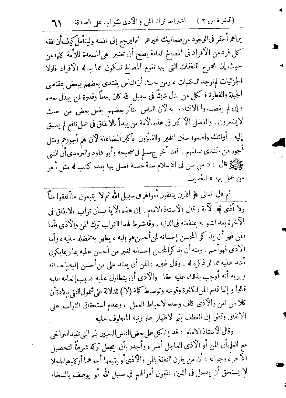 مِنْ غَيْرِ حَصْرٍ لِلنَّفَقَةِ فِيهَا، وَبِالنَّهْيِ عَنْ تَحَرِّي الْإِنْفَاقِ مِنَ الْخَبِيثِ خَاصَّةً دُونَ الطَّيِّبِ لَا عَنْ مُطْلَقِ الْإِنْفَاقِ مِنَ الْخَبِيثِ، فَلَا يَجُوزُ مَعَ هَذَا أَنْ يُرَادَ بِالطَّيِّبَاتِ الْحَلَالُ، وَبِالْخَبِيثِ الْمُحَرَّمُ، عَلَى أَنَّ الْأَصْلَ فِي مَالِ الْمُؤْمِنِينَ أَنْ يَكُونَ حَلَالًا، وَإِنَّمَا خُوطِبُوا بِالْإِنْفَاقِ مِمَّا فِي أَيْدِيهِمْ فَلَوْ أُرِيدَ