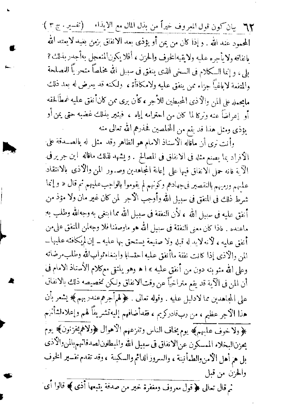 أَقُولُ: لَمْ يَبْقَ بَعْدَ هَذَا التَّرْغِيبِ وَالتَّرْهِيبِ، وَالتَّعْلِيمِ الْكَامِلِ وَالتَّأْدِيبِ، إِلَّا أَنْ يَكُونَ الْمُؤْمِنُ بِهَذَا الْهُدَى أَشَدَّ النَّاسِ رَغْبَةً فِي الصَّدَقَةِ وَالْإِنْفَاقِ فِي سَبِيلِ اللهِ بِحَسَبِ سَعَتِهِ وَحَالِهِ وَأَنْ يَكُونَ فِي بَذْلِهِ مُخْلِصًا مُتَحَرِّيًا مَوَاقِعَ الْفَائِدَةِ، مُبْتَعِدًا بَعْدَ الْبَذْلِ عَمَّا يَذْهَبُ بِثَمَرَتِهِ مِنَ الْمَنِّ وَالْأَذَى، وَلَكِنَّكَ تَجِدُ كَثِيرًا مِنَ اللَّابِسِينَ لِبَاسَ الْإِيمَانِ يَتَقَلَّبُونَ فِي النِّعَمِ وَهُمْ أَشَدُّ النَّاسِ لَهَا كُفْرًا ; إِذْ كَانُوا أَشَدَّ النَّاسِ إِمْسَاكًا وَبُخْلًا، وَقَدْ يُعَدُّ هَذَا مِنْ مُوَاطِنِ الْعَجَبِ، وَلَكِنَّ الْكِتَابَ الْحَكِيمَ قَدْ جَاءَنَا بِمَا لَهُ مِنَ الْعِلَّةِ وَالسَّبَبِ، وَأَرْشَدَنَا إِلَى طَرِيقِ التَّفَصِّي مِنْهُ وَالْهَرَبِ فَقَالَ: