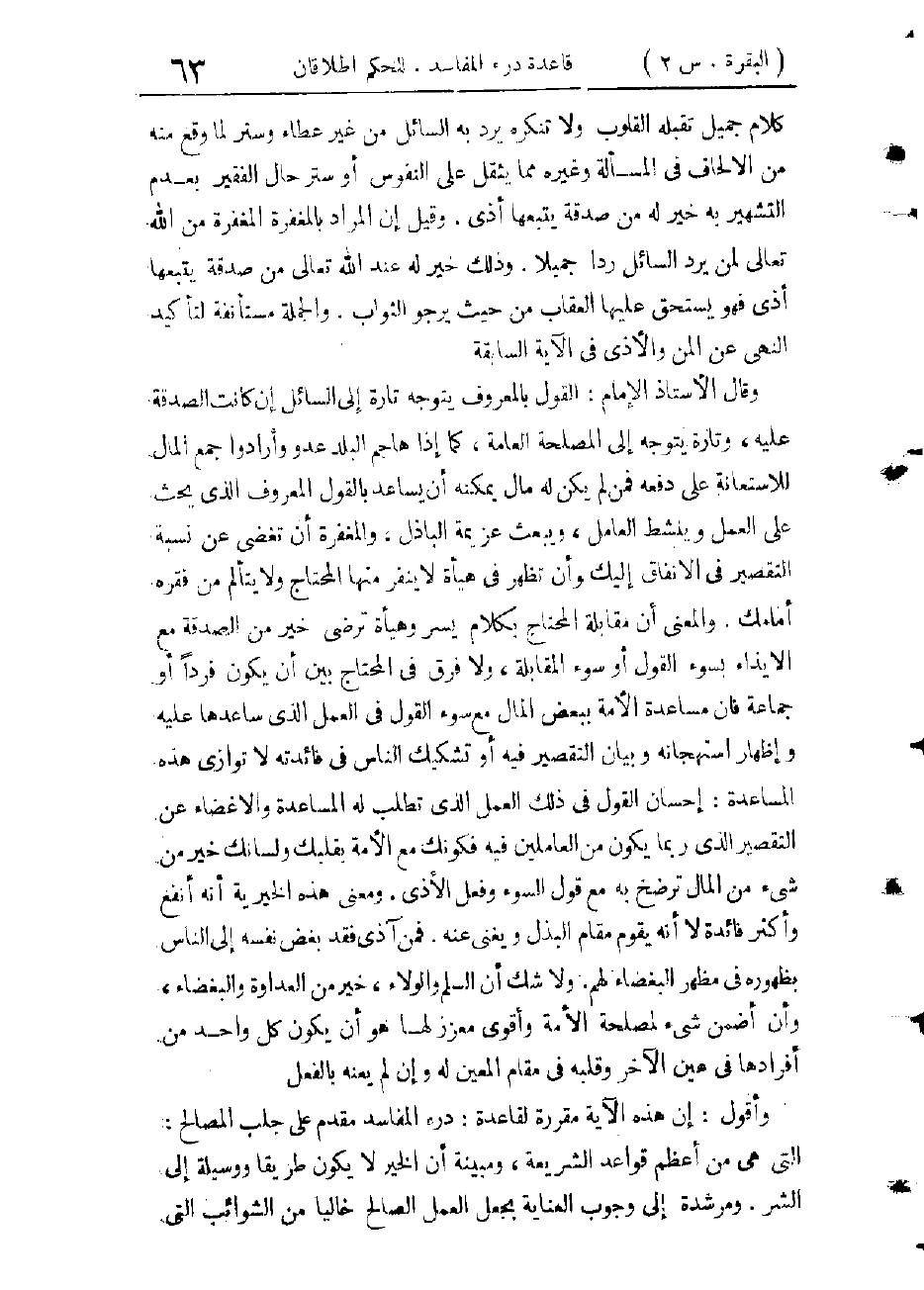 وَاللهُ يَعِدُكُمْ بِمَا أَنْزَلَهُ مِنَ الْوَحْيِ وَبِمَا أَوْدَعَهُ فِي النُّفُوسِ الزَّكِيَّةِ مِنَ الْإِلْهَامِ الصَّحِيحِ، وَالْعَقْلِ الرَّجِيحِ، وَفِي الْفِطَرِ السَّلِيمَةِ مِنْ حُبِّ الْخَيْرِ، وَالرَّغْبَةِ فِي الْبِرِّ مَغْفِرَةً مِنْهُ وَفَضْلًا فَإِنَّهُ جَعَلَ الْإِنْفَاقَ كَفَّارَةً لِكَثِيرٍ مِنَ الْخَطَايَا وَسَبَبًا يَفْضُلُ بِهِ الْمَرْءُ قَوْمَهُ وَيَسُودُهُمْ أَوْ يَسُودُ فِيهِمْ بِمَا يَجْذِبُ إِلَيْهِ مِنْ قُلُوبِ مَنْ يَكُونُ سَبَبًا فِي رِزْقِهِمْ، وَهَذَا الْفَضْلُ مِنَ الْجَاهِ بِالْحَقِّ - هَكَذَا قَالَ الْأُسْتَاذُ الْإِمَامُ - وَالْمَأْثُورُ عَنِ ابْنِ عَبَّاسٍ - رَضِيَ اللهُ عَنْهُمَا - أَنَّ الْفَضْلَ هُوَ مَا يُخْلِفُهُ اللهُ - تَعَالَى - عَلَى الْمُنْفِقِ مِنَ الرِّزْقِ، وَيُؤَيِّدُهُ قَوْلُهُ - تَعَالَى -: وَمَا أَنْفَقْتُمْ مِنْ شَيْءٍ فَهُوَ يُخْلِفُهُ وَهُوَ خَيْرُ الرَّازِقِينَ [34: 39] وَفِي حَدِيثِ الصَّحِيحَيْنِ مَا مِنْ يَوْمٍ يُصْبِحُ فِيهِ الْعِبَادُ إِلَّا وَمَلَكَانِ يَنْزِلَانِ يَقُولُ أَحَدُهُمَا: اللهُمَّ أَعْطِ مُنْفِقًا خَلَفًا، وَيَقُولُ الْآخَرُ: اللهُمَّ أَعْطِ مُمْسِكًا تَلَفًا أَيْ تَلَفًا لِمَالِهِ، بِأَنْ يَذْهَبَ حَيْثُ لَا يُفِيدُهُ. وَمَعْنَى هَذَا الدُّعَاءِ عِنْدِي: أَنَّ مِنْ سُنَّةِ اللهِ أَنْ يُخْلِفَ عَلَى الْمُنْفِقِ بِمَا يُسَهِّلُ لَهُ مِنْ أَسْبَابِ الرِّزْقِ وَيَرْفَعُ مِنْ شَأْنِهِ فِي الْقُلُوبِ، وَأَنْ يُحْرَمَ الْبَخِيلُ مِنْ مَثَلِ ذَلِكَ، وَعَلَى هَذَا يَكُونُ وَعْدُ اللهِ - تَعَالَى - بِشَيْئَيْنِ: أَحَدُهُمَا لِخَيْرِ الْآخِرَةِ وَهُوَ الْمَغْفِرَةُ، وَالثَّانِي لِخَيْرِ الدُّنْيَا وَهُوَ