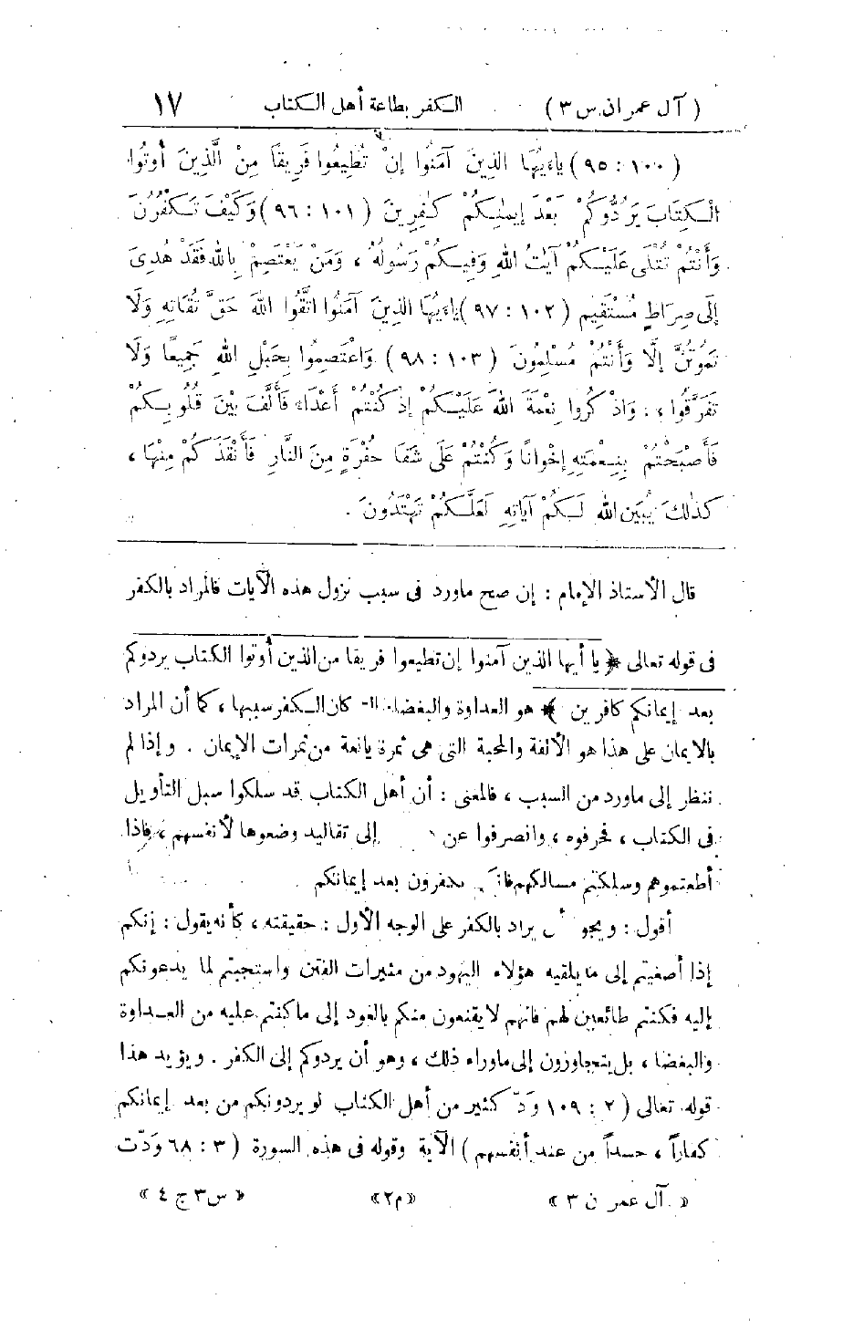 أَمَّا قَوْلُهُ - تَعَالَى -: وَلَا تَمُوتُنَّ إِلَّا وَأَنْتُمْ مُسْلِمُونَ فَمَعْنَاهُ عَلَى الْمُخْتَارِ عِنْدَ الْأُسْتَاذِ الْإِمَامِ: اسْتَمِرُّوا عَلَى الْإِسْلَامِ، وَحَافِظُوا عَلَى أَعْمَالِهِ حَتَّى الْمَوْتِ. فَالْمُرَادُ بِالْإِسْلَامِ عَلَى هَذَا الدِّينُ إِيمَانُهُ وَعَمَلُهُ، وَوَجْهُ الِاخْتِيَارِ أَنَّهُ جَاءَ فِي مُقَابَلَةِ قَوْلِهِ: يَرُدُّوكُمْ بَعْدَ إِيمَانِكُمْ كَافِرِينَ وَبَعْدَ الْأَمْرِ بِالتَّقْوَى حَقِّ التَّقْوَى. وَقِيلَ إِنَّ الْمُرَادَ بِهِ الْإِخْلَاصُ، وَقِيلَ الْإِيمَانُ دُونَ الْعَمَلِ ; لِأَنَّهُ هُوَ الَّذِي يَسْتَمِرُّ إِلَى الْمَوْتِ. أَقُولُ: وَهَذَا النَّهْيُ مَبْنِيٌّ عَلَى قَاعِدَةٍ أَنَّ الْمَرْءَ يَمُوتُ غَالِبًا عَلَى مَا عَاشَ عَلَيْهِ، فَإِذَا عَاشَ عَلَى الْيَقِينِ حَقَّ التَّقْوَى وَالِاحْتِرَاسِ مِمَّا يُنَافِي الْإِسْلَامَ مَاتَ عَلَى ذَلِكَ بِفَضْلِ اللهِ الَّذِي كَانَتْ تِلْكَ الْقَاعِدَةُ مِنْ سُنَنِهِ فِي خَلْقِهِ.