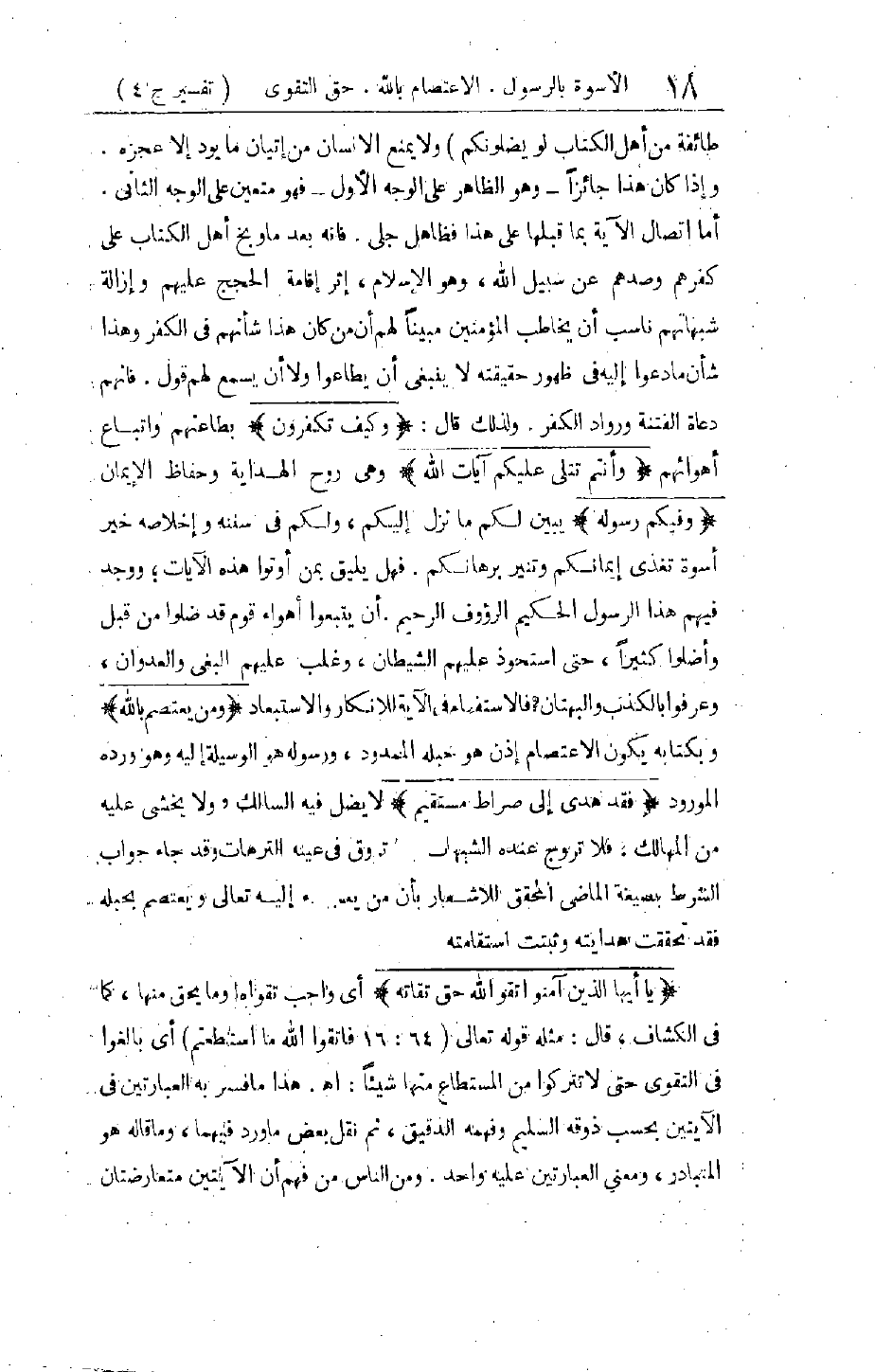 الْعَالَمِينَ، وَبِالْقُوَّةِ يُحْفَظُ هُوَ وَأَهْلُهُ مِنْ هَجَمَاتِ الْمُوَاثِبِينَ وَكَيْدِ الْكَائِدِينَ، فَهَذَا الْأَمْرُ وَالنَّهْيُ فِي مَعْنَى الْأَمْرِ وَالنَّهْيِ فِي قَوْلِهِ - تَعَالَى -: وَأَنَّ هَذَا صِرَاطِي مُسْتَقِيمًا فَاتَّبِعُوهُ وَلَا تَتَّبِعُوا السُّبُلَ فَتَفَرَّقَ بِكُمْ عَنْ سَبِيلِهِ [6: 153] فَحَبْلُ اللهِ هُوَ صِرَاطُهُ وَسَبِيلُهُ، وَمَا أَشَرْنَا إِلَيْهِ هُنَا مِنْ بَيَانِ أَنْوَاعِ التَّفَرُّقِ هُوَ السُّبُلُ الَّتِي نُهِيَ عَنِ اتِّبَاعِهَا فِي تِلْكَ الْآيَةِ، وَهِيَ قَدْ نَزَلَتْ قَبْلَ هَذِهِ الَّتِي نُفَسِّرُهَا ; لِأَنَّهَا فِي سُورَةِ الْأَنْعَامِ وَهِيَ مَكِّيَّةٌ، وَسُورَةُ آلِ عِمْرَانَ مَدَنِيَّةٌ، فَكَأَنَّهُ قَالَ: وَلَا تَفَرَّقُوا بِاتِّبَاعِ السُّبُلِ