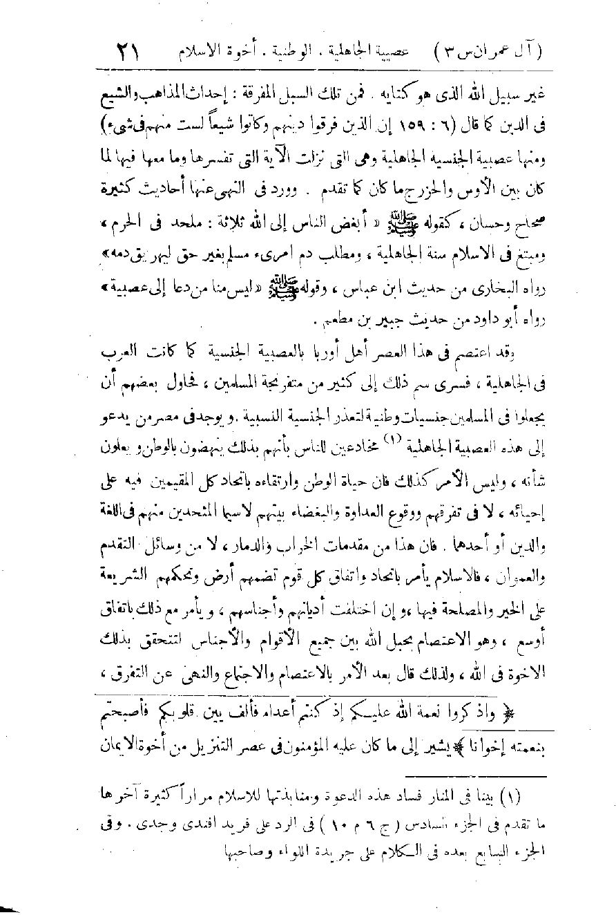 خَالَفَهُ فِي رَأْيٍ إِلَّا وَيُبَادِرُ إِلَى الرَّدِّ عَلَيْهِ بِالتَّأْلِيفِ وَبَذْلِ الْجُهْدِ فِي تَضْلِيلِهِ وَتَفْنِيدِ مَذْهَبِهِ، وَيُقَابِلُهُ الْآخَرُ بِمِثْلِ ذَلِكَ، لَا يُحَاوِلُ أَحَدٌ مِنْهُمْ مُحَادَثَةَ الْآخَرِ وَالِاطِّلَاعَ عَلَى دَلَائِلِهِ وَوَزْنَهَا بِمِيزَانِ الْإِنْصَافِ وَالْعَدْلِ، فَالْوَاجِبُ أَوَّلًا: مُحَاوَلَةُ الْفَهْمِ وَالْإِفْهَامِ فِي الْبَحْثِ وَالْمُذَاكَرَةِ - أَيْ وَلَوْ كِتَابَةً - وَثَانِيًا: أَلَّا يَكُونَ الْخِلَافُ مُفَرِّقًا بَيْنَ الْمُخْتَلِفِينَ فِي الدِّينِ. قَالَ: فَمَا دَامَ الْمُسْلِمُ لَا يُخِلُّ بِنُصُوصِ كِتَابِ اللهِ وَلَا بِاحْتِرَامِ الرَّسُولِ - صَلَّى اللَّهُ عَلَيْهِ وَسَلَّمَ - فَهُوَ عَلَى إِسْلَامِهِ لَا يَكْفُرُ وَلَا يَخْرُجُ مِنْ جَمَاعَةِ الْمُسْلِمِينَ، فَإِذَا تَحَكَّمَ الْهَوَى فَلَعَنَ بَعْضُهُمْ بَعْضًا وَكَفَّرَ بَعْضُهُمْ بَعْضًا فَقَدْ بَاءَ بِهَا مَنْ قَالَهَا كَمَا وَرَدَ فِي الْحَدِيثِ.