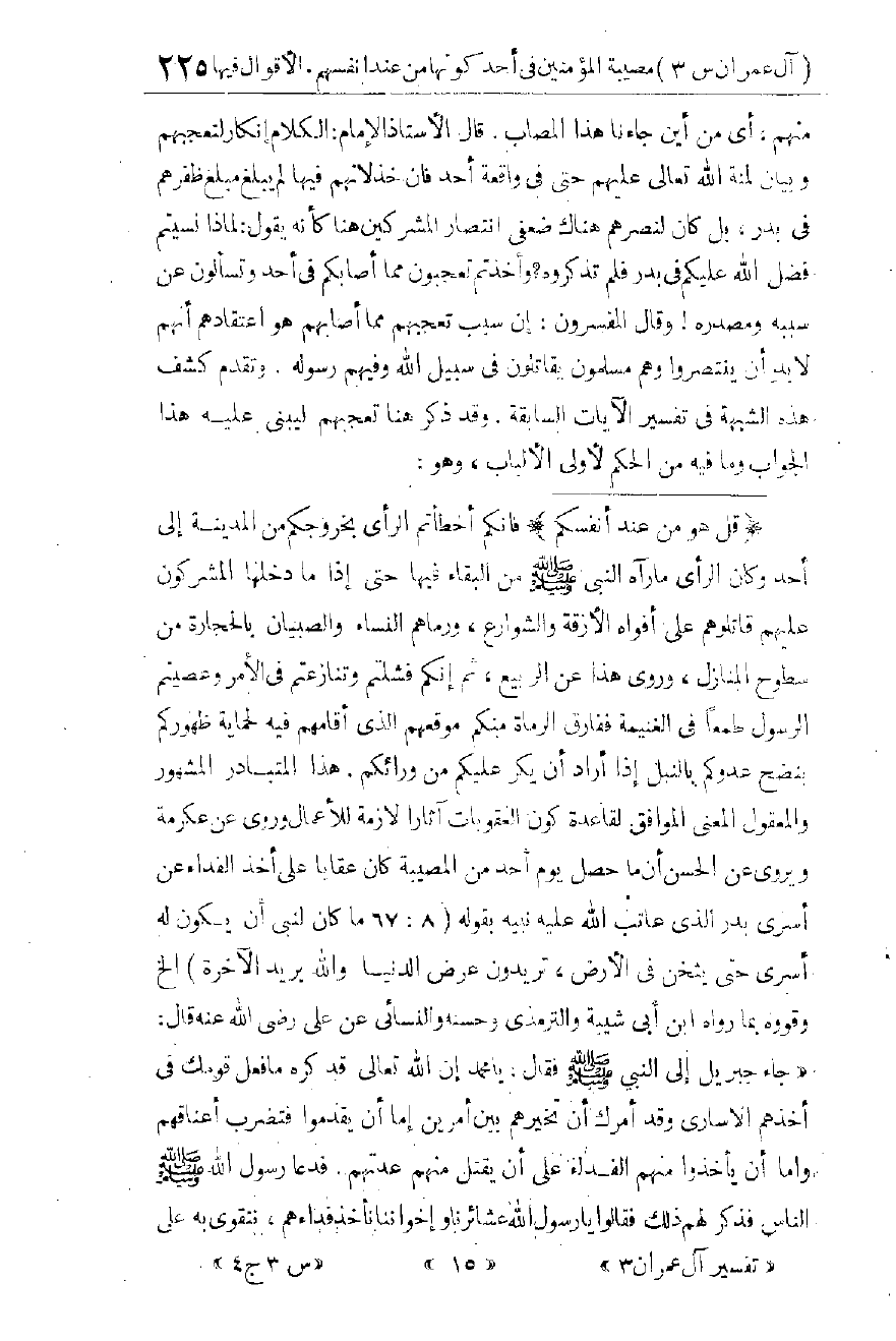 قَالَ: وَالِابْتِلَاءُ فِي الْأَمْوَالِ يُفَسَّرُ بِفَرْضِ الصَّدَقَاتِ، وَبِالْبَذْلِ فِي سَبِيلِ اللهِ - وَهُوَ كُلُّ مَا يُوصِلُ إِلَى الْخَيْرِ - وَبِالْجَوَائِحِ وَالْآفَاتِ وَهَذَا الْجَمْعُ أَوْلَى مِمَّا ذَهَبَ إِلَيْهِ بَعْضُهُمْ مِنْ تَخْصِيصِهِ بِالْأَوَّلِ، وَبَعْضُهُمْ مِنْ تَخْصِيصِهِ بِالثَّانِي. وَالِابْتِلَاءُ فِي الْأَنْفُسِ يَكُونُ بِتَكْلِيفِ بَذْلِهَا فِي سَبِيلِ اللهِ، وَبِمَوْتِ مَنْ يُحِبُّ الْإِنْسَانُ مِنَ الْأَهْلِ وَالْأَصْدِقَاءِ (أَقُولُ: وَكَذَا الِابْتِلَاءُ بِالْمَصَائِبِ الْبَدَنِيَّةِ كَالْأَمْرَاضِ وَالْجُرُوحِ) ، وَالِابْتِلَاءُ بِالتَّكْلِيفِ هُوَ أَهَمُّ الِابْتِلَاءَيْنِ، وَذَلِكَ أَنَّ اللهَ - تَعَالَى - لَمْ يَكْفُلْ لِلْمُسْلِمِينَ الْحِفْظَ، وَالنَّصْرَ، وَالسِّيَادَةَ لِأَنَّهُمْ مُسْلِمُونَ، وَإِنَّمَا يُكَلِّفُهُمُ الْجَرْيَ عَلَى سُنَّتِهِ - تَعَالَى - كَغَيْرِهِمْ، فَلَا بُدَّ لَهُمْ مِنْ الِاسْتِعْدَادِ لِلْمُدَافَعَةِ دَائِمًا، وَذَلِكَ يَقْتَضِي بَذْلَ الْمَالِ، وَالنَّفْسِ، وَمِنْ هُنَا تَعْلَمُ غَلَطَ الَّذِينَ يُفَسِّرُونَ الِابْتِلَاءَ بِالْمَالِ، وَالْأَمْرَ بِبَذْلِهِ، وَالْجِهَادَ بِهِ كُلَّ ذَلِكَ بِالزَّكَاةِ، وَمَا الزَّكَاةُ إِلَّا نَوْعٌ مِنْ أَنْوَاعِ الْحُقُوقِ الَّتِي جَعَلَهَا اللهُ فِي الْمَالِ وَهِيَ كَثِيرَةٌ تَشْمَلُ كُلَّ مَا بِهِ صَلَاحُ الْأُمَّةِ، وَرَفْعُ شَأْنِهَا مِنَ الْأَعْمَالِ، وَكُلَّ مَا يَدْفَعُ عَنْهَا الْأَعْدَاءَ، وَيَرُدُّ عَنْهَا الْمَكَارِهَ وَالْأَسْوَاءَ، (يَعْنِي كَالْأَعْمَالِ الَّتِي تُعْمَلُ لِلْوِقَايَةِ مِنَ الْأَمْرَاضِ وَالْأَوْبِئَةِ) ، وَمِنْ ذَلِكَ الِابْتِلَاءُ فِي الْمُدَافَعَةِ عَنِ الْحَقِّ سَوَاءٌ كَانَ بِالْمَالِ، أَوْ بِالنَّفْسِ، فَهُوَ يُوَطِّنُ نُفُوسَهُمْ عَلَى الْأَخْذِ بِالِاحْتِيَاطِ فِي الْأُمُورِ الْعَامَّةِ، وَالِاسْتِعَانَةِ عَلَيْهَا بِالْمَالِ، وَتَحَمُّلِ الْمَكَارِهِ، وَيُحَذِّرُهُمْ مِنَ الشَّرَهِ، وَالطَّمَعِ فِي الْمَالِ حَتَّى إِذَا طَمِعُوا، أَوْ قَصَّرُوا فِي الِاحْتِيَاطِ - كَمَا وَقَعَ لَهُمْ فِي أُحُدٍ - عَلِمُوا أَنَّهُمْ مَا أُصِيبُوا إِلَّا