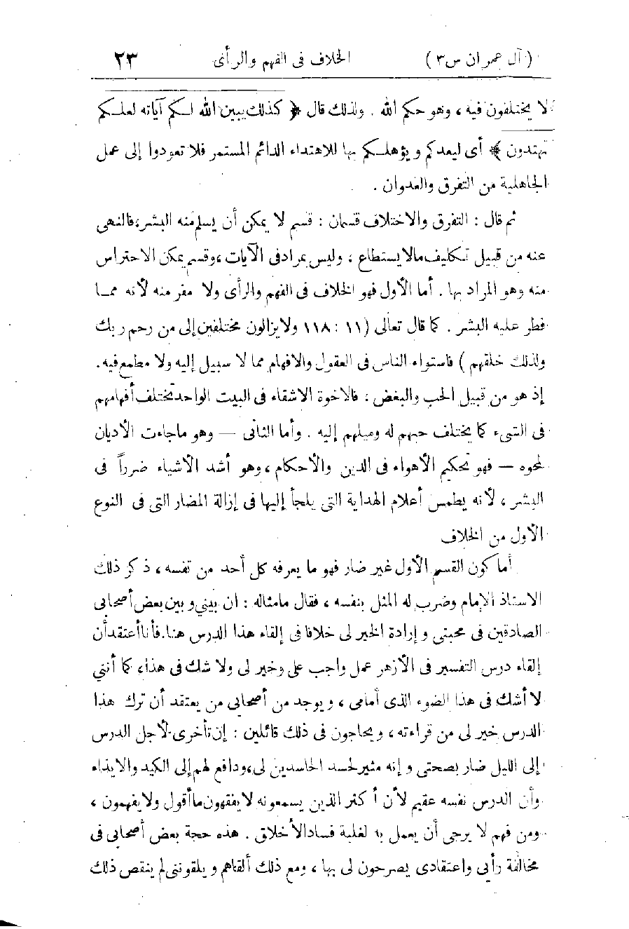 وَقَالَ بَعْضُهُمْ بِالثَّانِي، قَالُوا: وَالْمَعْنَى: وَلْتَكُونُوا أُمَّةً تَأْمُرُونَ بِالْمَعْرُوفِ وَتَنْهَوْنَ عَنِ الْمُنْكَرِ، قَالَ الْأُسْتَاذُ الْإِمَامُ: وَالظَّاهِرُ أَنَّ الْكَلَامَ عَلَى حَدِّ " لِيَكُنْ لِي مِنْكَ صَدِيقٌ " فَالْأَمْرُ عَامٌّ، وَيَدُلُّ عَلَى الْعُمُومِ قَوْلُهُ - تَعَالَى -: وَالْعَصْرِ إِنَّ الْإِنْسَانَ لَفِي خُسْرٍ إِلَّا الَّذِينَ آمَنُوا وَعَمِلُوا الصَّالِحَاتِ وَتَوَاصَوْا بِالْحَقِّ وَتَوَاصَوْا بِالصَّبْرِ [103: 1 - 3] فَإِنَّ التَّوَاصِيَ هُوَ الْأَمْرُ وَالنَّهْيُ، وَقَوْلُهُ - عَزَّ وَجَلَّ -: لُعِنَ الَّذِينَ كَفَرُوا مِنْ بَنِي إِسْرَائِيلَ عَلَى لِسَانِ دَاوُدَ وَعِيسَى ابْنِ مَرْيَمَ ذَلِكَ بِمَا عَصَوْا وَكَانُوا يَعْتَدُونَ كَانُوا لَا يَتَنَاهَوْنَ عَنْ مُنْكَرٍ فَعَلُوهُ لَبِئْسَ مَا كَانُوا يَفْعَلُونَ [5: 78، 79] وَمَا قَصَّ اللهُ عَلَيْنَا شَيْئًا مِنْ أَخْبَارِ الْأُمَمِ السَّالِفَةِ إِلَّا لِنَعْتَبِرَ بِهِ. وَقَدْ أَشَارَ الْمُفَسِّرُ (الْجَلَالُ) إِلَى الِاعْتِرَاضِ الَّذِي يَرِدُ عَلَى الْقَوْلِ بِالْعُمُومِ وَهُوَ أَنَّهُ يُشْتَرَطُ فِيمَنْ يَأْمُرُ وَيَنْهَى أَنْ يَكُونَ عَالِمًا بِالْمَعْرُوفِ الَّذِي يَأْمُرُ بِهِ وَالْمُنْكَرِ الَّذِي يَنْهَى عَنْهُ، وَفِي النَّاسِ جَاهِلُونَ لَا يَعْرِفُونَ الْأَحْكَامَ، وَلَكِنَّ هَذَا الْكَلَامَ لَا يَنْطَبِقُ عَلَى مَا يَجِبُ أَنْ يَكُونَ عَلَيْهِ الْمُسْلِمُ مِنَ الْعِلْمِ، فَإِنَّ الْمَفْرُوضَ الَّذِي يَنْبَغِي أَنْ يُحْمَلَ عَلَيْهِ خِطَابُ التَّنْزِيلِ هُوَ أَنَّ الْمُسْلِمَ لَا يَجْهَلُ مَا يَجِبُ عَلَيْهِ، وَهُوَ مَأْمُورٌ بِالْعِلْمِ وَالتَّفْرِقَةِ بَيْنَ الْمَعْرُوفِ وَالْمُنْكَرِ، عَلَى أَنَّ الْمَعْرُوفَ عِنْدَ إِطْلَاقِهِ يُرَادُ بِهِ مَا عَرَفَتْهُ الْعُقُولُ وَالطِّبَاعُ السَّلِيمَةُ، وَالْمُنْكَرُ ضِدُّهُ وَهُوَ مَا أَنْكَرَتْهُ الْعُقُولُ وَالطِّبَاعُ السَّلِيمَةُ، وَلَا يَلْزَمُ لِمَعْرِفَةِ هَذَا قِرَاءَةُ حَاشِيَةِ ابْنِ عَابِدِينَ عَلَى الدُّرِّ، وَلَا فَتْحِ الْقَدِيرِ وَلَا الْمَبْسُوطِ، وَإِنَّمَا الْمُرْشِدُ إِلَيْهِ - مَعَ سَلَامَةِ الْفِطْرَةِ - كِتَابُ اللهِ وَسُنَّةُ رَسُولِهِ الْمَنْقُولَةُ بِالتَّوَاتُرِ وَالْعَمَلِ، وَهُوَ مَا لَا يَسَعُ أَحَدًا جَهْلُهُ، وَلَا يَكُونُ الْمُسْلِمُ مُسْلِمًا إِلَّا بِهِ، فَالَّذِينَ مَنَعُوا عُمُومَ الْأَمْرِ بِالْمَعْرُوفِ وَالنَّهْيِ عَنِ الْمُنْكَرِ جَوَّزُوا أَنْ يَكُونَ الْمُسْلِمُ جَاهِلًا لَا يَعْرِفُ الْخَيْرَ مِنَ الشَّرِّ، وَلَا يُمَيِّزُ بَيْنَ الْمَعْرُوفِ وَالْمُنْكَرِ، وَهُوَ لَا يَجُوزُ دِينًا.