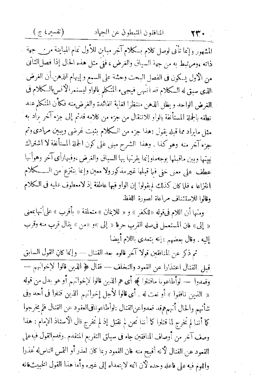 وَأَقُولُ: إِنَّ الَّذِينَ تَصَدَّوْا لِتَبْيِينِ الْقُرْآنِ فِي الْكُتُبِ - وَهُمُ الْمُفَسِّرُونَ - لَمْ يَكُنْ تَبْيِينُهُمْ كَامِلًا كَمَا يَنْبَغِي، وَكَانَ جَمَالُ الدِّينِ يَقُولُ: " إِنَّ الْقُرْآنَ لَا يَزَالُ بِكْرًا "، وَإِنَّ لِي كَلِمَةً مَا زِلْتُ أَقُولُهَا، وَهِيَ أَنَّ سَبَبَ تَقْصِيرِ الْمُفَسِّرِينَ الَّذِينَ وَصَلَتْ إِلَيْنَا كُتُبُهُمْ هُوَ عَدَمُ الِاسْتِقْلَالِ التَّامِّ فِي الْفَهْمِ، وَمَا كَانَ ذَلِكَ لِبَلَادَةٍ، وَإِنَّمَا جَاءَ مِنْ أُمُورٍ أَهَمُّهَا: الِافْتِتَانُ بِالرِّوَايَاتِ الْكَثِيرَةِ، وَتَغَلُّبُ الِاصْطِلَاحَاتِ الْفَنِّيَّةِ فِي الْكَلَامِ، وَالْأُصُولِ، وَالْفِقْهِ، وَغَيْرِ ذَلِكَ، وَمُحَاوَلَةُ نَصْرِ الْمَذَاهِبِ، وَتَأْيِيدِهَا.