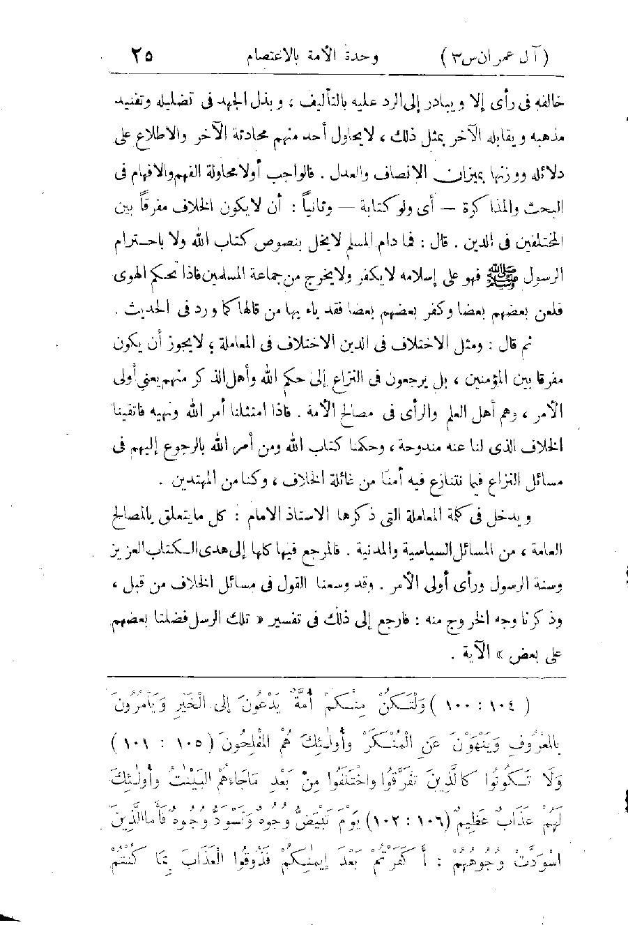 وَتَكَادُ الْأُمَّةُ الَّتِي يَفْشُو هَذَا فِيهَا أَنْ تَكُونَ مِنَ الْأُمَمُ الَّتِي تُوُدِّعَ مِنْهَا، وَإِنَّمَا الْكَلَامُ فِي الدَّعْوَةِ إِلَى الْخَيْرِ وَالْأَمْرِ بِالْمَعْرُوفِ وَالنَّهْيِ عَنِ الْمُنْكَرِ مَعَ الْمُسْلِمِينَ الَّذِينَ كَانُوا يَشْعُرُونَ بِنِعْمَةِ اللهِ عَلَيْهِمْ بِالتَّأْلِيفِ بَيْنَ قُلُوبِهِمْ وَإِنْقَاذِهِمْ مِنَ النَّارِ بَعْدَ أَنْ كَانُوا قَدْ أَشَفَوْا عَلَيْهَا، وَمَعَ مَنْ يُشَارِكُونَهُمْ فِي شُعُورِهِمْ ذَاكَ وَيَتَّبِعُونَ سُنَّتَهُمْ فِي الِاهْتِدَاءِ بِمَا أَنْزَلَ اللهُ ; كَمَا وَقَعَ بَيْنَ الْأَوْسِ وَالْخَزْرَجِ فِي الرِّوَايَةِ الَّتِي سَبَقَ ذِكْرُهَا، فَأَمْثَالُ هَؤُلَاءِ هُمُ الَّذِينَ يَصْدُقُ عَلَيْهِمْ قَوْلُهُ - صَلَّى اللَّهُ عَلَيْهِ وَسَلَّمَ -: الْمُؤْمِنُ مِرْآةُ الْمُؤْمِنِ رَوَاهُ الطَّبَرَانِيُّ فِي الْأَوْسَطِ وَالضِّيَاءُ مِنْ حَدِيثِ أَنَسٍ، وَرَوَاهُ الْبُخَارِيُّ فِي الْأَدَبِ الْمُفْرَدِ، وَأَبُو دَاوُدَ
