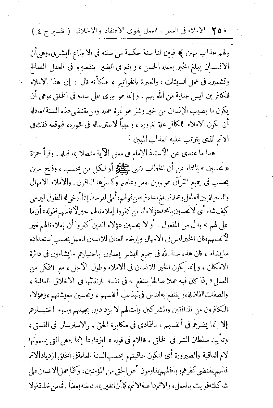 الْمَرْأَةُ الظَّنَّ بِنَفْسِهَا فَتَتَوَهَّمَ أَنَّ جَعْلَ الرَّجُلِ رَئِيسًا عَلَيْهَا يَقْتَضِي أَنْ يَكُونَ أَرْفَعَ مَنْزِلَةً عِنْدَ اللهِ - تَعَالَى - مِنْهَا. وَقَدْ بَيَّنَ اللهُ - تَعَالَى - عِلَّةَ هَذِهِ الْمُسَاوَاةِ بِقَوْلِهِ: بَعْضُكُمْ مِنْ بَعْضٍ فَالرَّجُلُ مَوْلُودٌ مِنَ الْمَرْأَةِ، وَالْمَرْأَةُ مَوْلُودَةٌ مِنَ الرَّجُلِ، فَلَا فَرْقَ فِي الْبَشَرِيَّةِ، وَلَا تَفَاضُلَ بَيْنَهُمَا إِلَّا بِالْأَعْمَالِ، أَيْ وَمَا تَتَرَتَّبُ عَلَيْهِ الْأَعْمَالُ، وَيَتَرَتَّبُ هُوَ عَلَيْهَا مِنَ الْعُلُومِ وَالْأَخْلَاقِ.