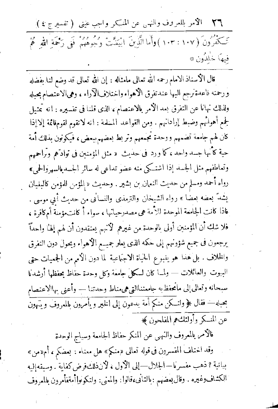 قَالَ الْأُسْتَاذُ الْإِمَامُ: وَيَشْتَرِطُ بَعْضُهُمْ لِلْوُجُوبِ شَرْطًا آخَرَ، وَهُوَ الْأَمْنُ عَلَى النَّفْسِ، وَكَانَ يَنْبَغِي أَنْ يَقُولُوا: عَلَى الْآمِرِ بِالْمَعْرُوفِ وَالنَّاهِي عَنِ الْمُنْكَرِ أَنْ يَدْعُوَ