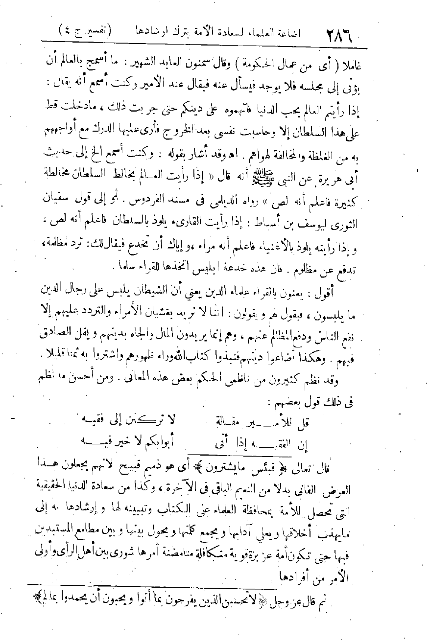 قَالَ: فَمَنْ تَأَمَّلَ الْآيَتَيْنِ عَلِمَ أَنَّ إِبَاحَةَ تَعَدُّدِ الزَّوْجَاتِ فِي الْإِسْلَامِ أَمْرٌ مُضَيَّقٌ فِيهِ أَشَدَّ التَّضْيِيقِ كَأَنَّهُ ضَرُورَةٌ مِنَ الضَّرُورَاتِ الَّتِي تُبَاحُ لِمُحْتَاجِهَا بِشَرْطِ الثِّقَةِ بِإِقَامَةِ الْعَدْلِ، وَالْأَمْنِ مِنَ الْجَوْرِ. وَإِذَا تَأَمَّلَ الْمُتَأَمِّلُ مَعَ هَذَا التَّضْيِيقِ مَا يَتَرَتَّبُ عَلَى التَّعَدُّدِ فِي هَذَا الزَّمَانِ مِنَ الْمَفَاسِدِ جَزَمَ بِأَنَّهُ لَا يُمْكِنُ لِأَحَدٍ أَنْ يُرَبِّيَ أُمَّةً فَشَا فِيهَا تَعَدُّدُ الزَّوْجَاتِ، فَإِنَّ الْبَيْتَ الَّذِي فِيهِ زَوْجَتَانِ لِزَوْجٍ وَاحِدٍ لَا تَسْتَقِيمُ لَهُ حَالٌ، وَلَا يَقُومُ فِيهِ نِظَامٌ، بَلْ يَتَعَاوَنُ الرَّجُلُ مَعَ زَوْجَاتِهِ عَلَى إِفْسَادِ الْبَيْتِ كَأَنَّ كُلَّ وَاحِدٍ مِنْهُمْ عَدُوٌّ لِلْآخَرِ، ثُمَّ يَجِيءُ الْأَوْلَادُ بَعْضُهُمْ لِبَعْضٍ عَدُوٌّ، فَمَفْسَدَةُ تَعَدُّدِ الزَّوْجَاتِ تَنْتَقِلُ مِنَ الْأَفْرَادِ إِلَى الْبُيُوتِ، وَمِنَ الْبُيُوتِ إِلَى الْأُمَّةِ.