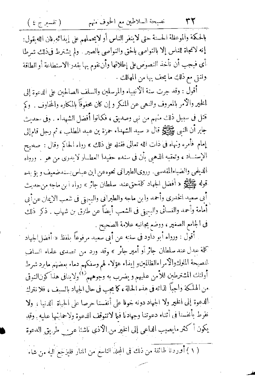 إِلَيْهَا وَهُوَ مَا لَوْ تُرِكَ لَتَسَرَّبَ الْفَسَادُ إِلَى مَجْمُوعِ الْمُسْلِمِينَ. وَقَدْ كَانَ الْمُسْلِمُونَ فِي الصَّدْرِ الْأَوَّلِ وَلَا سِيَّمَا عَلَى عَهْدِ الْخَلِيفَتَيْنِ أَبِي بَكْرٍ وَعُمَرَ - رَضِيَ اللهُ عَنْهُمَا - عَلَى هَذِهِ الطَّرِيقَةِ، فَقَدْ كَانَتْ خَاصَّةُ الصَّحَابَةِ الَّذِينَ عَاشَرُوا النَّبِيَّ - صَلَّى اللَّهُ عَلَيْهِ وَسَلَّمَ - وَتَلَقَّوْا عَنْهُ مُتَوَاصِلِينَ مُتَكَاتِفِينَ، يَشْعُرُ كُلُّ مِنْهُمْ بِمَا يَشْعُرُ بِهِ الْآخَرُ مِنَ الْحَاجَةِ إِلَى نَشْرِ الْإِسْلَامِ وَحِفْظِهِ، وَمُقَاوَمَةِ كُلِّ مَا يَمَسُّ شَيْئًا مِنْ عَقَائِدِهِ وَآدَابِهِ وَأَحْكَامِهِ وَمَصَالِحِ أَهْلِهِ، وَكَانَ سَائِرُ الْمُسْلِمِينَ تَبَعًا لَهُمْ، وَلَا نَتَكَلَّمُ هُنَا فِيمَا طَرَأَ عَلَى الْإِسْلَامِ فَأَزَالَ تِلْكَ الْوَحْدَةَ وَلَكِنَّنَا نَذْكُرُ مَا يَجِبُ أَنْ تَكُونَ عَلَيْهِ الْأُمَّةُ الدَّاعِيَةُ إِلَى الْخَيْرِ الْآمِرَةُ بِالْمَعْرُوفِ النَّاهِيَةُ عَنِ الْمُنْكَرِ، أَيِ الْقَائِمَةُ بِالْوَاجِبَاتِ الَّتِي هِيَ قِوَامُ الْوَحْدَةِ وَحِفَاظُهَا، فَإِنَّ أَعْمَالَهَا لَا تَتِمُّ إِلَّا بِأُمُورٍ كَثِيرَةٍ. أَقُولُ: وَذَكَرَ أُمُورًا مُجْمَلَةً عَلَى سَبِيلِ الْمِثَالِ نُفَصِّلُهَا وَنَزِيدُ عَلَيْهَا فَنَقُولُ: