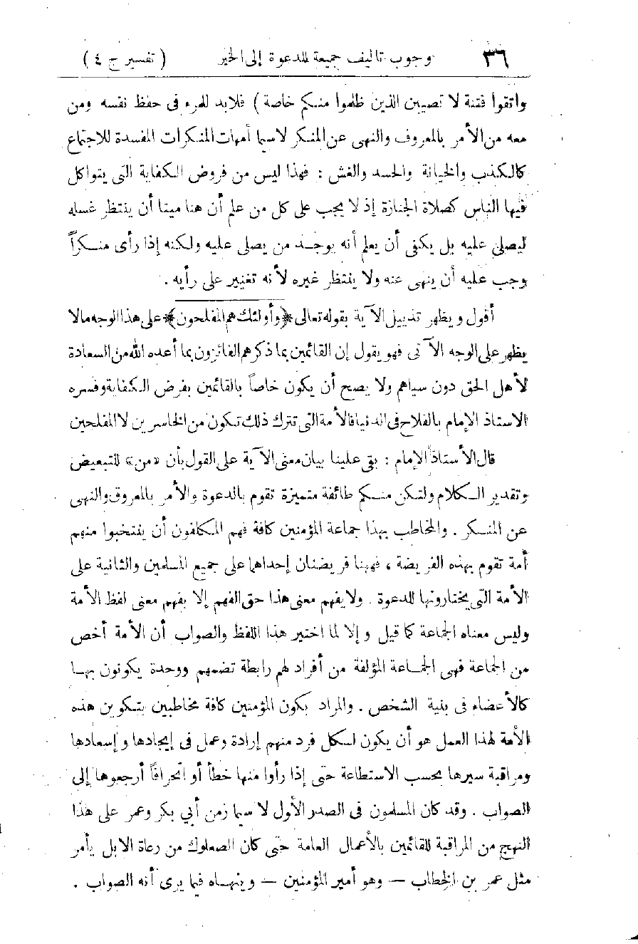 وَالْأُصُولِ لِأَجْلِ فَهْمِ الدِّينِ دَلِيلًا عَلَى وُجُوبِ تَعَلُّمِ طُرُقِ الدَّعْوَةِ وَمَا تَحْتَاجُ إِلَيْهِ فِي هَذَا الزَّمَانِ بِطَرِيقَةٍ صِنَاعِيَّةٍ، فَإِذَا كَانَتِ الدَّعْوَةُ فِي الصَّدْرِ الْأَوَّلِ قَدْ تَيَسَّرَتْ بِغَيْرِ تَعْلِيمٍ صِنَاعِيٍّ وَلَا تَأْلِيفِ جَمْعِيَّةٍ مُعَيَّنَةٍ كَمَا كَانَ فَهْمُ الدِّينِ مُتَيَسِّرًا بِغَيْرِ تَعَلُّمٍ صِنَاعِيٍّ فَفِي هَذَا الزَّمَانِ يَتَوَقَّفُ فَهْمُ الدِّينِ عَلَى التَّعْلِيمِ الصِّنَاعِيِّ، وَتَتَوَقَّفُ الدَّعْوَةُ إِلَيْهِ وَالْأَمْرُ بِمَا جَاءَ بِهِ مِنَ الْمَعْرُوفِ وَمَا حَظَرَهُ مِنَ الْمُنْكَرِ عَلَى تَعْلِيمٍ خَاصٍّ وَتَأْلِيفِ جَمْعِيَّاتٍ خَاصَّةٍ تَقُومُ بِهَذَا الْعَمَلِ، وَلَا يَنْتَشِرُ الدِّينُ وَلَا يُحْفَظُ عَلَى وَجْهِهِ إِلَّا بِهَذَا كَمَا تَقَدَّمَ