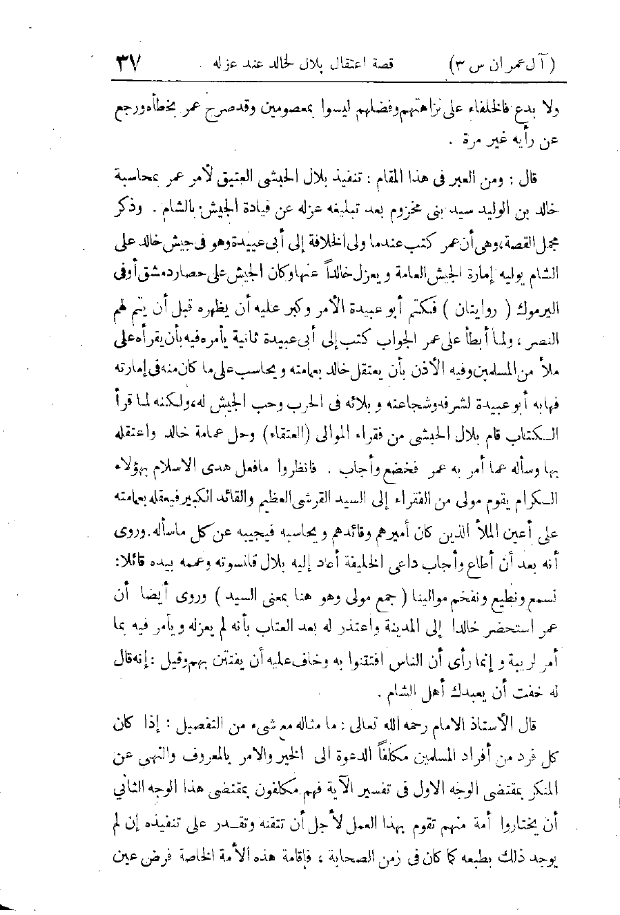 أَقُولُ: وَمَعْنَى الْآيَةِ عَلَى هَذَا الْوَجْهِ أَنَّهُ يَجِبُ أَنْ تَكُونَ قُوَّةُ الْمُسْلِمِينَ تَابِعَةً لِهَذِهِ الْأُمَّةِ الَّتِي تَقُومُ بِفَرِيضَةِ الدَّعْوَةِ إِلَى الْخَيْرِ وَالْأَمْرِ بِالْمَعْرُوفِ وَالنَّهْيِ عَنِ الْمُنْكَرِ، فَهِيَ بِمَعْنَى مَجَالِسِ النُّوَّابِ فِي الْحُكُومَاتِ الْجُمْهُورِيَّةِ وَالْمَلَكِيَّةِ الْمُقَيَّدَةِ، فَكَأَنَّ الْآيَةَ بَيَانٌ لِكَوْنِ أَمْرِ الْمُسْلِمِينَ شُورَى بَيْنَهُمْ، وَمَا ذَكَرَهُ فِي مَعْنَى وَأَمْرُهُمْ شُورَى وَمَعْنَى وَشَاوِرْهُمْ فِي الْأَمْرِ لَعَلَّهُ يُرِيدُ بِهِ أَنَّهُ يُمْكِنُ أَنْ يُقَالَ فِيهِمَا كَذَا، وَإِلَّا فَكُلٌّ مِنَ النَّصَّيْنِ دَالٌّ عَلَى وُجُوبِ كَوْنِ حُكُومَةِ