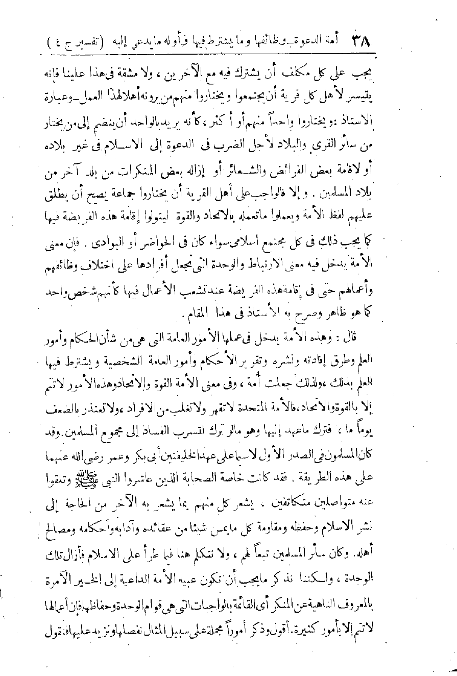 قَالَ: ثُمَّ إِنَّ كَوْنَ الْقَائِمِينَ بِالْأَمْرِ وَالنَّهْيِ أُمَّةً يَسْتَلْزِمُ أَنْ يَكُونَ لَهَا رِيَاسَةٌ تُدَبِّرُهَا ; لِأَنَّ أَمْرَ الْجَمَاعَةِ بِغَيْرِ رِيَاسَةٍ يَكُونُ مُخْتَلًّا مُعْتَلًّا، فَكُلُّ كَوْنٍ لَا رِيَاسَةَ فِيهِ فَاسِدٌ، فَالرَّأْسُ هُوَ مَرْكَزُ تَدْبِيرِ الْبَدَنِ وَتَصْرِيفِ الْأَعْضَاءِ فِي أَعْمَالِهَا، وَكَذَلِكَ يَكُونُ رَئِيسُ هَذِهِ الْأُمَّةِ مَصْدَرَ النِّظَامِ وَتَوْزِيعِ الْأَعْمَالِ عَلَى الْعَامِلِينَ، فَمِنْهُمْ مَنْ يُوَجَّهُونَ إِلَى دَعْوَةِ غَيْرِ الْمُسْلِمِينَ إِلَى الْإِسْلَامِ، وَمِنْهُمْ مَنْ يُوَجَّهُونَ إِلَى إِرْشَادِ الْمُسْلِمِينَ فِي بِلَادِهِمْ، وَمَقَامُ الرِّيَاسَةِ يَخْتَارُ بِالْمُشَاوَرَةِ لِكُلِّ عَمَلٍ وَلِكُلِّ بِلَادٍ مَنْ يَكُونُونَ أَكْفَاءَ لِلْقِيَامِ بِالْوَاجِبِ فِيهَا ; لِتَكُونَ أَعْمَالُهُمْ مُؤَدِّيَةً إِلَى مَقْصِدِ الْأُمَّةِ الْعَامِّ، فَإِنَّ مِنْ مَعْنَى الْأُمَّةِ أَنْ يَكُونَ لِلْأَفْرَادِ الَّذِينَ تَتَكَوَّنُ مِنْهُمْ وَحْدَةٌ فِي الْقَصْدِ مِنْ أَعْمَالِهِمْ وَسَيْرِهِمْ فَإِذَا اخْتَلَفَتِ الْمَقَاصِدُ فَسَدَ الْعَمَلُ بِاخْتِلَافِ الْآرَاءِ وَتَنْكِيثِ الْقُوَى ; وَلِذَلِكَ جَاءَ بَعْدَ هَذِهِ الْآيَةِ النَّهْيُ عَنِ التَّفَرُّقِ وَالِاخْتِلَافِ.