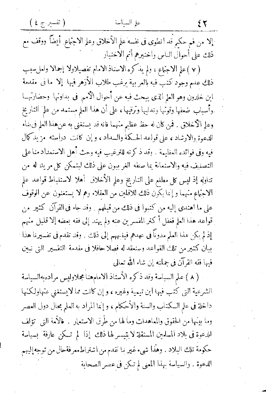 وَفِي هَذَا الْمَقَامِ أَوْرَدَ الْأُسْتَاذُ الْإِمَامُ هَذَا السُّؤَالَ: هَلْ قَامَ الْمُسْلِمُونَ بِذَلِكَ الْأَمْرِ وَلْتَكُنْ مِنْكُمْ أُمَّةٌ وَانْتَهَوْا عَنْ هَذَا النَّهْيِ وَلَا تَكُونُوا كَالَّذِينَ تَفَرَّقُوا وَاخْتَلَفُوا؟ وَجَعَلَ ذَلِكَ مَجَالًا لِتَفَكُّرِ طُلَّابِ الْعِلْمِ، وَأَمَّا جَوَابُهُ هُوَ فَكَمَا نَقَلْنَا لَكَ عَنِ الْإِمَامِ الرَّازِيِّ وَعَنْ شَيْخِهِ، وَالْأَمْرُ ظَاهِرٌ فِي نَفْسِهِ وَفِي الْوَعِيدِ الْمَذْكُورَيْنِ آنِفًا، وَإِذَا كَانَ لَا يَزَالُ فِي عُلَمَاءِ الرُّسُومِ مِنَّا مَنْ يَقُولُ وَيَعْتَقِدُ أَنَّ الْمُسْلِمِينَ فِي فَلَاحٍ وَفَوْزٍ فَقَدْ عَلِمَ سَائِرُ الْمُسْلِمِينَ مِنْ جَمِيعِ الطَّبَقَاتِ فِي أَكْثَرِ الْبِلَادِ أَنَّهُمْ قَدْ فَقَدُوا عِزَّهُمْ وَاسْتِقْلَالَهُمْ، وَأَنَّهُمْ مُعَذَّبُونَ بِمَا فَقَدُوا وَبِمَا يَتَوَقَّعُونَ أَنْ يَفْقِدُوا مِمَّا بَقِيَ لَهُمْ، وَأَنَّ أَذْكِيَاءَ شُعُوبِهِمْ يَسْأَلُ بَعْضُهُمْ بَعْضًا عَلَى بُعْدِ الدَّارِ وَقُرْبِهِ عَنْ طَرِيقِ عِلَاجِ الدَّاءِ، قَبْلَ الْإِبْدَاءِ، وَالتَّمَاسِ الشِّفَاءِ قَبْلَ الْإِشْفَاءِ، وَالْعِلَاجُ بَيْنَ أَيْدِيهِمْ فَمَتَى يُبْصِرُونَ! وَالطَّبِيبُ يُنَادِيهِمْ فَأَنَّى يَسْمَعُونَ؟ عَسَى أَنْ يَكُونَ ذَلِكَ قَرِيبًا.