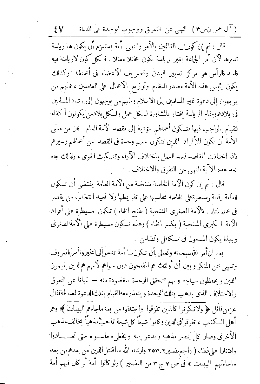 بَعْدَ مَا أَمَرَ اللهُ - تَعَالَى - بِالِاعْتِصَامِ بِحَبْلِهِ وَذَكَّرَ بِنِعْمَتِهِ عَلَى الْمُؤْمِنِينَ بِتَأْلِيفِ الْقُلُوبِ وَأُخُوَّةِ الْإِسْلَامِ، وَبَعْدَ مَا نَهَى عَنِ التَّفَرُّقِ فِي الْأَهْوَاءِ وَالِاخْتِلَافِ فِي الدِّينِ، وَتَوَعَّدُ عَلَى ذَلِكَ بِالْعَذَابِ الْعَظِيمِ - بَيَّنَ فَضْلَ الْمُعْتَصِمِينَ بِحَبْلِهِ، الْمُتَآخِينَ فِي دِينِهِ، الْمُتَحَابِّينَ فِيهِ، وَوَصَفَهُمْ بِهَذَا الْوَصْفِ الشَّرِيفِ كُنْتُمْ خَيْرَ أُمَّةٍ أُخْرِجَتْ لِلنَّاسِ تَأْمُرُونَ بِالْمَعْرُوفِ وَتَنْهَوْنَ عَنِ الْمُنْكَرِ وَتُؤْمِنُونَ بِاللهِ فَعُلِمَ مِنْهُ أَنَّ خَيْرِيَّةَ الْأُمَّةِ وَفَضْلَهَا عَلَى غَيْرِهَا تَكُونُ بِهَذِهِ الْأُمُورِ: الْأَمْرُ بِالْمَعْرُوفِ، وَالنَّهْيُ عَنِ الْمُنْكَرِ، وَالْإِيمَانُ بِاللهِ - تَعَالَى -.