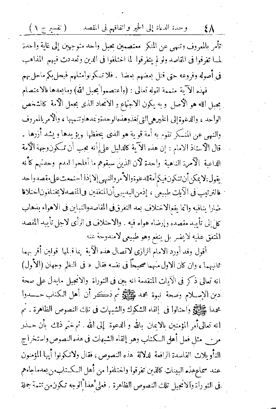 قَالَ الْأُسْتَاذُ الْإِمَامُ مَا مَعْنَاهُ: هَذَا الْوَصْفُ يَصْدُقُ عَلَى الَّذِينَ خُوطِبُوا بِهِ أَوَّلًا، وَهُمُ النَّبِيُّ - صَلَّى اللَّهُ عَلَيْهِ وَسَلَّمَ - وَأَصْحَابُهُ الَّذِينَ كَانُوا مَعَهُ - عَلَيْهِمُ الرِّضْوَانُ -، فَهُمُ الَّذِينَ كَانُوا أَعْدَاءً فَأَلَّفَ اللهُ بَيْنَ قُلُوبِهِمْ فَكَانُوا بِنِعْمَتِهِ إِخْوَانًا، وَهُمُ الَّذِينَ اعْتَصَمُوا بِحَبْلِ اللهِ وَلَمْ يَتَفَرَّقُوا فِي الدِّينِ فَيَذْهَبُوا فِيهِ مَذَاهِبَ تَتَعَصَّبُ لِكُلِّ مَذْهَبٍ شِيعَةٌ مِنْهُمْ، وَهُمُ الَّذِينَ كَانُوا يَأْمُرُونَ بِالْمَعْرُوفِ وَيَنْهَوْنَ عَنِ الْمُنْكَرِ لَا يَخَافُ فِي ذَلِكَ ضَعِيفٌ قَوِيًّا، وَلَا يَهَابُ صَغِيرٌ كَبِيرًا، وَهُمُ الْمُؤْمِنُونَ بِاللهِ ذَلِكَ الْإِيمَانَ الَّذِي اسْتَوْلَى عَلَى عُقُولِهِمْ وَقُلُوبِهِمْ وَمَشَاعِرِهِمْ، وَمَلَكَ أَزِمَّةَ أَهْوَائِهِمْ حَتَّى كَانَ هُوَ الْمُسِيِّرَ لَهُمْ فِي عَامَّةِ أَحْوَالِهِمْ - ذَلِكَ الْإِيمَانُ الَّذِي بَيَّنَ - سُبْحَانَهُ - خَوَاصَّهُ وَصِفَاتَهُ فِي آيَاتٍ كَثِيرَةٍ، وَظَهَرَتْ فَوَائِدُهُ وَآثَارُهُ فِي تَغْيِيرِ هَيْئَةِ الْأَرْضِ عَلَى أَيْدِيهِمْ - ذَلِكَ الْإِيمَانُ الَّذِي قَالَ - تَعَالَى - فِي أَهْلِهِ: إِنَّمَا الْمُؤْمِنُونَ الَّذِينَ آمَنُوا بِاللهِ وَرَسُولِهِ ثُمَّ لَمْ يَرْتَابُوا وَجَاهَدُوا بِأَمْوَالِهِمْ وَأَنْفُسِهِمْ فِي سَبِيلِ اللهِ أُولَئِكَ هُمُ الصَّادِقُونَ [49: 15] وَقَالَ فِيهِمْ: إِنَّمَا الْمُؤْمِنُونَ الَّذِينَ إِذَا ذُكِرَ اللهُ وَجِلَتْ قُلُوبُهُمْ وَإِذَا تُلِيَتْ عَلَيْهِمْ آيَاتُهُ زَادَتْهُمْ إِيمَانًا