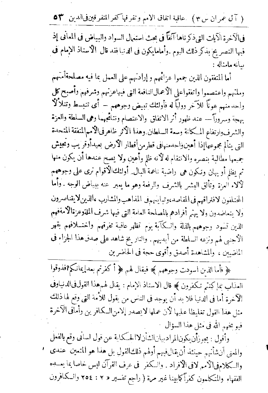وَجَعَلَ الْأُسْتَاذُ الْإِمَامُ هَذِهِ الْجُمْلَةَ مُتَعَلِّقَةً بِمَجْمُوعِ الْكَلَامِ السَّابِقِ فَقَالَ: إِنَّهُ بَعْدَ مَا نَهَانَا - سُبْحَانَهُ - عَنِ التَّفَرُّقِ وَالِاخْتِلَافِ كَمَا تَفَرَّقَ أَهْلُ الْكِتَابِ بَعْدَ مَا جَاءَهُمُ الْبَيِّنَاتُ، وَأَمَرَنَا بِالدَّعْوَةِ إِلَى الْخَيْرِ وَالْأَمْرِ بِالْمَعْرُوفِ وَالنَّهْيِ عَنِ الْمُنْكَرِ. وَذَكَرَ أَنَّنَا خَيْرُ أُمَّةٍ أُخْرِجَتْ لِلنَّاسِ بِهَذَا أَوْ بِالْإِيمَانِ الْحَقِيقِيِّ الَّذِي يَقْتَرِنُ بِالْإِذْعَانِ النَّفْسِيِّ وَالِاتِّبَاعِ الْعَمَلِيِّ - نَاسَبَ أَنْ يَذْكُرَ أَنَّ أَهْلَ الْكِتَابِ الْمُخْتَلِفِينَ لَيْسُوا مُؤْمِنِينَ هَذَا الْإِيمَانَ الْخَالِصَ الَّذِي يُحِبُّهُ اللهُ - تَعَالَى - وَيَرْضَاهُ، وَهُوَ الَّذِي يَكُونُ الْأَمْرُ بِالْمَعْرُوفِ ثَمَرَةً مِنْ ثِمَارِهِ، وَالنَّهْيُ عَنِ الْمُنْكَرِ أَثَرًا مِنْ آثَارِهِ، فَعَلِمْنَا أَنَّ الْمُرَادَ بِهَذَا الْإِيمَانِ