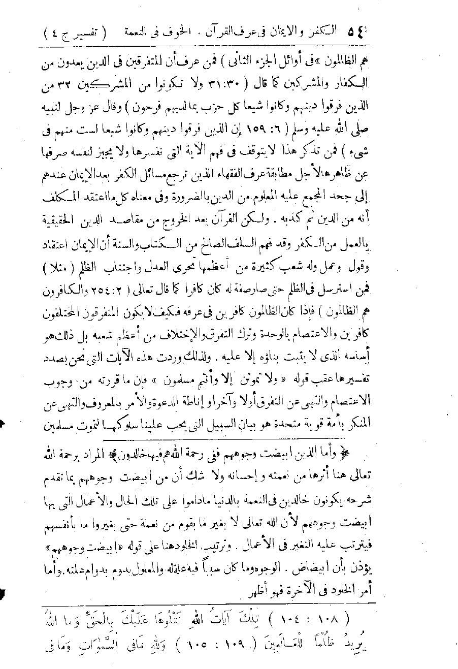 أَهْلُ الْكِتَابِ بِمَا آمَنْتُمْ بِهِ كَمَا آمَنْتُمْ لَكَانَ خَيْرًا لَهُمْ فِي الدُّنْيَا وَالْآخِرَةِ، وَلَكِنْ آمَنَ بَعْضُهُمْ فَمِنْهُمُ الْمُؤْمِنُونَ كَعَبْدِ اللهِ بْنِ سَلَامٍ وَرَهْطِهِ مِنَ الْيَهُودِ وَالنَّجَاشِيِّ وَرَهْطِهِ مِنَ النَّصَارَى وَأَكْثَرُهُمْ فَاسِقُونَ عَنْ دِينِهِمْ أَيْ خَارِجُونَ مِنْهُ، أَوْ فَاسِقُونَ فِي دِينِهِمْ غَيْرُ عُدُولٍ فِيهِ فَلَا حَصَّلُوا الْإِسْلَامَ وَهُوَ أَكْمَلُ الْأَدْيَانِ وَلَا تَمَسَّكُوا بِمَا عِنْدَهُمْ، أَوْ أَكْثَرُهُمْ مُتَمَرِّدُونَ فِي الْكُفْرِ. هَكَذَا اخْتَلَفَ تَعْبِيرُهُمْ فَيُؤْخَذُ مِنْهُ أَنَّهُ لَمْ يَكُنْ فِي أَهْلِ الْكِتَابِ أَحَدٌ مُتَمَسِّكٌ بِدِينِهِ مُخْلِصًا فِيهِ، عَامِلًا بِأَوَامِرِهِ وَنَوَاهِيهِ، وَهَذَا غَيْرُ مَعْقُولٍ وَلَا مُوَافِقٌ لِمَا عُرِفَ مِنْ طَبِيعَةِ الْبَشَرِ مِنْ مَيْلِ أُنَاسٍ مِنْهُمْ إِلَى الْغُلُوِّ فِي الدِّينِ وَاعْتِدَالِ أُنَاسٍ آخَرِينَ وَمَيْلِ غَيْرِ هَؤُلَاءِ وَأُولَئِكَ إِلَى الْفُسُوقِ وَالْعِصْيَانِ، فَمَا مِنْ أَهْلِ دِينٍ إِلَّا وَفِيهِمُ الْفِرَقُ الثَّلَاثُ، وَإِنَّمَا يَكْثُرُ الِاسْتِمْسَاكُ بِالدِّينِ فِي أَوَائِلِ ظُهُورِهِ، وَيَكْثُرُ الْفِسْقُ بَعْدَ طُولِ الْأَمَدِ عَلَيْهِ. قَالَ - تَعَالَى -: أَلَمْ يَأْنِ لِلَّذِينِ آمَنُوا أَنْ تَخْشَعَ قُلُوبُهُمْ لِذِكْرِ اللهِ وَمَا نَزَلَ مِنَ الْحَقِّ وَلَا يَكُونُوا كَالَّذِينِ أُوتُوا الْكِتَابَ مِنْ قَبْلُ فَطَالَ عَلَيْهِمُ الْأَمَدُ فَقَسَتْ قُلُوبُهُمْ وَكَثِيرٌ مِنْهُمْ فَاسِقُونَ [57: 16] فَمَاعَدَا هَذَا الْكَثِيرُ هُمُ الْمُسْتَمْسِكُونَ بِدِينِهِمْ، وَالْقُرْآنُ لَمْ يَحْكُمْ عَلَى أُمَّةٍ بِالضَّلَالِ وَالْفِسْقِ بِنَصٍّ عَامٍّ يَسْتَغْرِقُ جَمِيعَ الْأَفْرَادِ، بَلْ يُعَبِّرُ تَارَةً بِالْكَثِيرِ وَتَارَةً بِالْأَكْثَرِ، وَإِذَا أَطْلَقَ أَدَاةَ الْعُمُومِ يَسْتَثْنِي بِمِثْلِ قَوْلِهِ فِي بَنِي إِسْرَائِيلَ: ثُمَّ تَوَلَّيْتُمْ إِلَّا قَلِيلًا مِنْكُمْ وَأَنْتُمْ مُعْرِضُونَ [2: 83] وَقَوْلِهِ فِيهِمْ: فَلَا يُؤْمِنُونَ إِلَّا قَلِيلًا [4: 155] أَوْ يَحْكُمُ عَلَى الْبَعْضِ ابْتِدَاءً كَمَا تَقَدَّمَ فِي قَوْلِهِ: