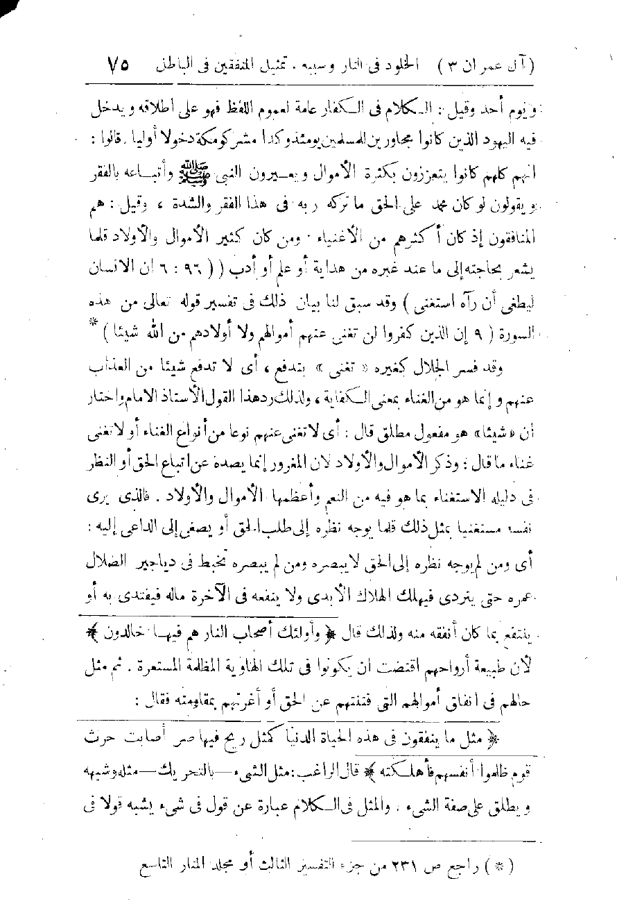 وَكَوْنِهَا كَشَخْصٍ وَاحِدٍ: وَإِذَا لَقُوكُمْ قَالُوا آمَنَّا وَإِذَا خَلَوْا عَضُّوا عَلَيْكُمُ الْأَنَامِلَ مِنَ الْغَيْظِ كَانَ بَعْضُ الْيَهُودِ يُظْهِرُونَ الْإِيمَانَ لِلنَّبِيِّ - صَلَّى اللَّهُ عَلَيْهِ وَسَلَّمَ - وَالْمُؤْمِنِينَ نِفَاقًا وَخِدَاعًا، وَمِنْهُمْ مَنْ كَانَ يُظْهِرُهُ ثُمَّ يَرْجِعُ عَنْهُ لِيُشَكِّكَ الْمُسْلِمِينَ، كَمَا تَقَدَّمَ فِي آيَةِ " 72 " مِنْ هَذِهِ السُّورَةِ وَإِذَا خَلَا بَعْضُهُمْ إِلَى بَعْضٍ أَظْهَرُوا مَا فِي نُفُوسِهِمْ مِنَ الْغَيْظِ وَالْحِقْدِ الَّذِي لَا يَسْتَطِيعُونَ مَعَهُ إِلَى التَّشَفِّي سَبِيلًا، وَعَضُّ الْأَنَامِلِ: كِنَايَةٌ عَنْ شِدَّةِ الْغَيْظِ، وَيُكَنَّى بِهِ أَيْضًا عَنِ النَّدَمِ قُلْ مُوتُوا بِغَيْظِكُمْ فَإِنَّ الْإِسْلَامَ الَّذِي هُوَ سَبَبُ غَيْظِكُمْ لَا يَزْدَادُ بِاعْتِصَامِ أَهْلِهِ بِهِ إِلَّا عِزَّةً وَقُوَّةً وَانْتِشَارًا، وَقَالَ ابْنُ جَرِيرٍ: " مُوتُوا بِغَيْظِكُمُ الَّذِي عَلَى الْمُؤْمِنِينَ لِاجْتِمَاعِ كَلِمَتِهِمْ وَائْتِلَافِ جَمَاعَتِهِمْ " فَلْيَعْتَبِرِ الْمُسْلِمُونَ الْيَوْمَ بِهَذَا لَعَلَّهُمْ يَتَذَكَّرُونَ أَنَّهُ مَا حَلَّ بِهِمْ مَا حَلَّ مِنَ الْأَرْزَاءِ إِلَّا بِزَوَالِ هَذَا الِاجْتِمَاعِ وَالِائْتِلَافِ وَبِالتَّفَرُّقِ بَعْدَ الِاعْتِصَامِ إِنَّ اللهَ عَلِيمٌ بِذَاتِ الصُّدُورِ فَهُوَ يَعْلَمُ مَا تَضُمُّ صُدُورُكُمْ مِنْ شُعُورِ الْغَيْظِ وَالْبَغْضَاءِ وَمَوْجِدَةِ الْحِقْدِ وَالْحَسَدِ، فَكَيْفَ يَخْفَى عَلَيْهِ مَا تَقُولُونَ فِي خَلَوَاتِكُمْ وَمَا يُبْدِيهِ بَعْضُكُمْ لِبَعْضٍ مِنْ ذَلِكَ وَيَعْلَمُ كَذَلِكَ مَا تَنْطَوِي عَلَيْهِ صُدُورُنَا مَعْشَرَ الْمُؤْمِنِينَ مِنْ حُبِّ الْخَيْرِ وَالنُّصْحِ لَكُمْ.
