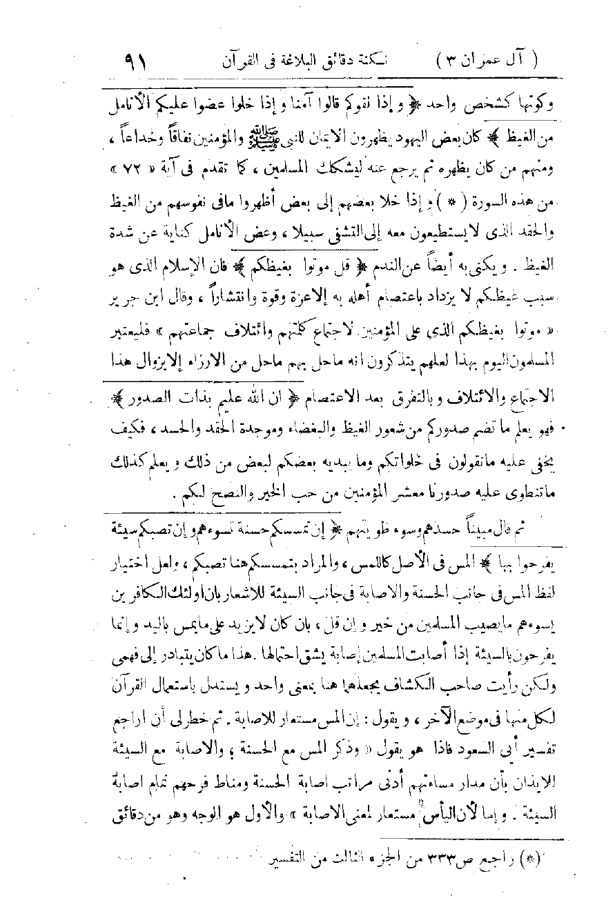 تَقُولُ فِيهِ لَهُمْ: أَلَنْ يَكْفِيَكُمْ إِلَخْ. أَخْرَجَ ابْنُ أَبِي شَيْبَةَ وَابْنُ الْمُنْذِرِ وَغَيْرُهُمَا عَنِ الشَّعْبِيِّ أَنَّ الْمُسْلِمِينَ بَلَغَهُمْ يَوْمَ بَدْرٍ أَنَّ كُرْزَ بْنَ جَابِرٍ الْمُحَارِبِيَّ يُرِيدُ أَنْ يُمِدَّ الْمُشْرِكِينَ ; فَشَقَّ ذَلِكَ عَلَيْهِمْ فَأَنْزَلَ اللهُ: أَلَنْ يَكْفِيَكُمْ إِلَخْ. فَبَلَغَتْ كُرْزًا الْهَزِيمَةُ فَلَمْ يُمِدَّ الْمُشْرِكِينَ. وَرَوَاهُ ابْنُ جَرِيرٍ عَنِ الشَّعْبِيِّ وَعَنْ غَيْرِهِ، وَذَكَرَ الْخِلَافَ فِي حُصُولِ هَذَا الْإِمْدَادِ بِالْفِعْلِ وَأَنَّ بَعْضَهُمْ يَقُولُ: إِنَّهُ لَمْ يَحْصُلْ، وَبَعْضَهُمْ قَالَ: إِنَّهُ حَصَلَ يَوْمَ بَدْرٍ، وَنُقِلَ عَنْ بَعْضِهِمْ أَنَّ الْوَعْدَ بِالْإِمْدَادِ - وَإِنْ لَمْ يَحْصُلْ بِبَدْرٍ - عَامٌّ فِي كُلِّ الْحُرُوبِ، وَأَنَّهُمْ أُمِدُّوا فِي حَرْبِ قُرَيْظَةَ وَالنَّضِيرِ وَالْأَحْزَابِ، وَلَمْ يُمَدُّوا يَوْمَ أُحُدٍ لِأَنَّهُمْ لَمْ يَصْبِرُوا وَلَمْ يَتَّقُوا. وَرُوِيَ عَنِ الضَّحَّاكِ أَنَّ هَذَا كَانَ مَوْعِدًا مِنَ اللهِ يَوْمَ أُحُدٍ عَرَضَهُ عَلَى نَبِيِّهِ مُحَمَّدٍ - صَلَّى اللَّهُ عَلَيْهِ وَسَلَّمَ - أَنَّ الْمُؤْمِنِينَ إِنِ اتَّقَوْا وَصَبَرُوا أَمَدَّهُمْ بِخَمْسَةِ آلَافٍ. وَرُوِيَ نَحْوُهُ عَنِ ابْنِ زَيْدٍ قَالَ: " قَالُوا لِرَسُولِ اللهِ - صَلَّى اللَّهُ عَلَيْهِ وَسَلَّمَ - وَهُمْ يَنْظُرُونَ الْمُشْرِكِينَ: أَلَيْسَ اللهُ يُمِدُّنَا كَمَا أَمَدَّنَا يَوْمَ بَدْرٍ؟ فَقَالَ رَسُولُ - صَلَّى اللَّهُ عَلَيْهِ وَسَلَّمَ -: أَلَنْ يَكْفِيَكُمْ أَنْ يُمِدَّكُمْ رَبُّكُمْ بِثَلَاثَةِ آلَافٍ مِنَ الْمَلَائِكَةِ مُنْزَلَيْنِ وَإِنَّمَا أَمَدَّكُمْ يَوْمَ بَدْرٍ بِأَلْفٍ. قَالَ: فَجَاءَتِ الزِّيَادَةُ بَلَى إِنْ تَصْبِرُوا وَتَتَّقُوا وَيَأْتُوكُمْ مِنْ فَوْرِهِمْ هَذَا يُمْدِدْكُمْ رَبُّكُمْ بِخَمْسَةِ آلَافٍ مِنَ الْمَلَائِكَةِ مُسَوَّمِينَ الْفَوْرُ: فِي الْأَصْلِ فَوَرَانُ الْقِدْرِ وَنَحْوِهَا، ثُمَّ اسْتُعِيرَ الْفَوْرُ لِلسُّرْعَةِ، ثُمَّ سُمِّيَتْ بِهِ الْحَالَةُ الَّتِي لَا رَيْثَ فِيهَا وَلَا تَعْرِيجَ مِنْ صَاحِبِهَا عَلَى شَيْءٍ، فَمَعْنَى وَيَأْتُوكُمْ مِنْ فَوْرِهِمْ مِنْ سَاعَتِهِمْ هَذِهِ بِدُونِ إِبْطَاءٍ وَمُسَوِّمِينَ مِنَ التَّسْوِيمِ، قَرَأَهَا ابْنُ كَثِيرٍ وَأَبُو عَمْرٍو وَعَاصِمٌ وَيَعْقُوبُ