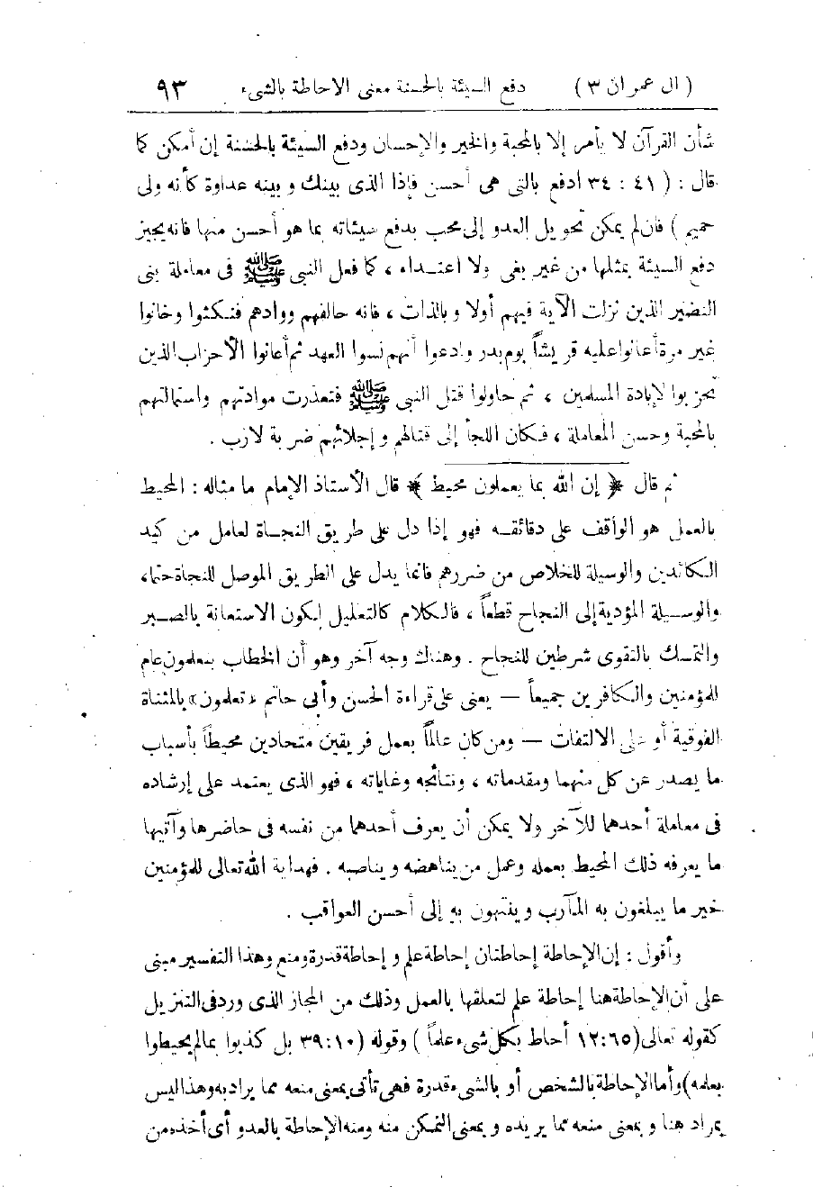 وَمَنْفَعَتَهُ مَعَ بَيَانِ الْحَقِيقَةِ، وَهِيَ أَنَّ النَّصْرَ بِيَدِ اللهِ الْعَزِيزِ، أَيِ الْقَوِيِّ الَّذِي لَا يَمْتَنِعُ عَلَيْهِ شَيْءٌ الْحَكِيمِ الَّذِي يُدِيرُ الْأَمْرَ عَلَى خَيْرِ سَنَنٍ، وَيُقِيمُهُ بِأَحْسَنِ سُنَنٍ، فَيَهْدِي لِأَسْبَابِ النَّصْرِ الظَّاهِرَةِ وَالْبَاطِنَةِ مَنْ يَشَاءُ، وَيَصْرِفُ عَنْهُمَا مَنْ يَشَاءُ. فَإِنْ حَصَلَ الْإِمْدَادُ بِالْمَلَائِكَةِ فِعْلًا فَمَا يَكُونُ إِلَّا جُزْءًا مِنْ أَجْزَاءِ سَبَبِ النَّصْرِ أَوْ فَرْدًا مِنْ أَفْرَادِهِ، وَمِنْهُ إِلْقَاءُ الرُّعْبِ وَالْخَوْفِ فِي قُلُوبِ الْأَعْدَاءِ، وَمِنْهُ سَائِرُ الْأَسْبَابِ الْمَعْرُوفَةِ مِنَ الصَّبْرِ وَالثَّبَاتِ وَحُسْنِ التَّدْبِيرِ وَمَعْرِفَةِ الْمَوَاقِعِ وَغَيْرِ ذَلِكَ، فَإِنَّ النَّبِيَّ - صَلَّى اللَّهُ عَلَيْهِ وَسَلَّمَ -