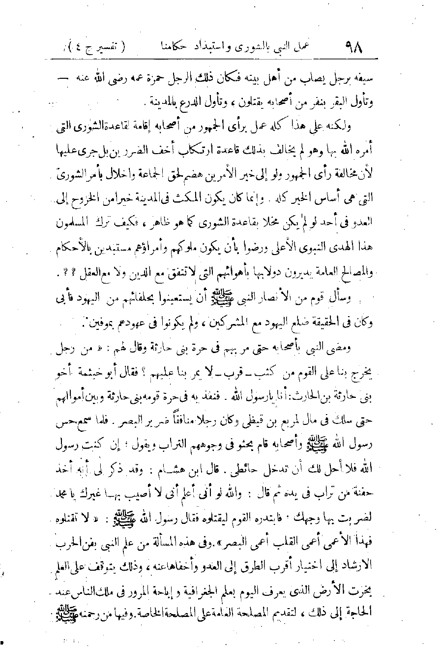 هَذَا الْبَيَانُ الْإِلَهِيُّ فِي هَذِهِ الْوَاقِعَةِ يَتَمَكَّنُ فِي النُّفُوسِ مَا لَا يَتَمَكَّنُ لَوْ لَمْ يَكُنْ مَقْرُونًا بِوَاقِعَةٍ مَشْهُورَةٍ لَا مَجَالَ مَعَهَا لِتَأْوِيلِهِ وَلَا لِتَخْصِيصِهِ أَوْ تَقْيِيدِهِ، فَهُوَ مِنْ أَقْوَى دَعَائِمِ التَّوْحِيدِ فِي الْقُرْآنِ، وَدَلَائِلِ نُبُوَّةِ النَّبِيِّ - صَلَّى اللَّهُ عَلَيْهِ وَسَلَّمَ - إِذْ لَوْ كَانَ النَّبِيُّ - صَلَّى اللَّهُ عَلَيْهِ وَسَلَّمَ - مُؤَسِّسَ مُلْكٍ، وَزَعِيمَ سِيَاسَةٍ يُدِيرُهَا بِالرَّأْيِ لَمَا قَالَ مِثْلَ هَذَا الْقَوْلِ فِي مِثْلِ هَذَا الْمَوْطِنِ، فَأَيُّ نَصِيبٍ مِنْ هَذَا الدِّينِ لِلَّذِينَ يَجْعَلُونَ أَمْرَ الْعِبَادِ وَتَدْبِيرَ شُئُونِ الْكَوْنِ لِطَائِفَةٍ مِنْ أَصْحَابِ الْقُبُورِ أَوِ الْأَحْيَاءِ الَّذِينَ يُلَقَّبُونَ بِالْمَشَايِخِ وَالْأَوْلِيَاءِ فَيَزْعُمُونَ أَنَّهُمْ يَنْصُرُونَ وَيَخْذُلُونَ، وَيُسْعِدُونَ وَيُشْقُونَ، وَيُمِيتُونَ وَيُحْيُونَ، وَيُغْنُونَ وَيُفْقِرُونَ، وَيُمْرِضُونَ وَيَشْفُونَ، وَيَفْعَلُونَ كُلَّ مَا يَشَاءُونَ؟ هَلْ يُعَدُّ هَؤُلَاءِ مَنْ أَهْلِ الْإِسْلَامِ وَأَتْبَاعِ الْقُرْآنِ الَّذِي يُخَاطِبُ خَاتَمَ النَّبِيِّينَ وَالْمُرْسَلِينَ - حِينَ لَعَنَ رُؤَسَاءَ الْمُشْرِكِينَ الَّذِينَ حَارَبُوهُ حَتَّى خَضَّبُوا بِالدَّمِ مُحَيَّاهُ وَكَسَرُوا إِحْدَى ثَنَايَاهُ - بِقَوْلِهِ: لَيْسَ لَكَ مِنَ الْأَمْرِ شَيْءٌ وَقَوْلِهِ: قُلْ إِنَّ الْأَمْرَ كُلَّهُ لِلَّهِ؟ هَذَا تَعْلِيمُ الْقُرْآنِ الْحَكِيمِ وَهَذَا هَدْيُهُ الْقَوِيمُ، فَهَلْ كَانَ أَهْلُ بُخَارَى مُهْتَدِينَ بِهِ عِنْدَمَا كَانُوا يَقُولُونَ وَقَدْ عَلِمُوا بِعَزْمِ رُوسْيَا عَلَى الِاسْتِيلَاءِ عَلَى بِلَادِهِمْ: إِنَّ " شَاهْ نَقْشَبَنْدَ " هُوَ حَامِي هَذِهِ الْبِلَادِ فَلَنْ يَسْتَطِيعَهَا أَحَدٌ؟ هَلْ كَانَ أَهْلُ فَاسَ مُهْتَدِينَ بِهِ عِنْدَمَا لَجَئُوا إِلَى قَبْرِ وَلِيِّهِمْ " إِدْرِيسَ "