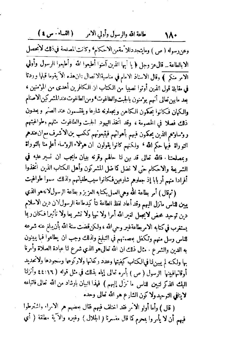 هَذَا مَا فُتِحَ بِهِ عَلَيْنَا عِنْدَ طَبْعِ تَفْسِيرِ هَذِهِ الْآيَةِ الْحَكِيمَةِ مِنَ الْمَسَائِلِ الَّتِي يَتَجَلَّى بِهِ مَعْنَاهَا، وَالتَّرْجِيحُ بَيْنَ أَقْوَالِ الْمُفَسِّرِينَ فِيهَا أَنَّهُ يَجِبُ عَلَى جَمِيعِ الْمُؤْمِنِينَ طَاعَةُ اللهِ بِالْعَمَلِ بِكِتَابِهِ، وَطَاعَةُ رَسُولِهِ بِاتِّبَاعِ سُنَّتِهِ، وَطَاعَةُ جَمَاعَةِ أُولِي الْأَمْرِ ـ وَهُمْ أَهْلُ الْحَلِّ وَالْعَقْدِ مِنْ عُلَمَاءِ الْأُمَّةِ وَرُؤَسَائِهَا الْمَوْثُوقِ بِهِمْ عِنْدَهَا ـ فِيمَا يَضَعُونَهُ لَهَا بِالشُّورَى مِنَ الْأَحْكَامِ الْمَدَنِيَّةِ، وَالْقَضَائِيَّةِ، وَالسِّيَاسِيَّةِ، وَمِنْهَا الصِّحِّيَّةُ وَالْعَسْكَرِيَّةُ، وَإِذَا وَقَعَ التَّنَازُعُ بَيْنَ أُولِي الْأَمْرِ، أَوْ بَيْنَ أَفْرَادِ الْأُمَّةِ وَجَمَاعَاتِهَا فِي شَيْءٍ فَيَجِبُ رَدُّهُ إِلَى اللهِ وَرَسُولِهِ بِعَرْضِهِ عَلَى الْكِتَابِ وَالسُّنَّةِ، وَالْعَمَلُ بِمَا يَظْهَرُ لِلْمُتَنَازِعِينَ أَوْ لِمَنْ يُحَكِّمُونَهُمْ فِي فَصْلِ النِّزَاعِ مِنَ النُّصُوصِ، أَوْ مُقْتَضَى الْقَوَاعِدِ وَالْأُصُولِ الْعَامَّةِ فِيهِمَا أَوِ الْقِيَاسِ عَلَى مَا عُرِفَتْ عِلَّتُهُ فِيهِمَا، وَلَا نُسَلِّمُ قَوْلَ الرَّازِيِّ وَالنَّيْسَابُورِيِّ: إِنَّ هَذَا الرَّدَّ خَاصٌّ بِمَا لَا نَصَّ فِيهِ وَلَا إِجْمَاعَ ; لِأَنَّهُ مَبْنِيٌّ عَلَى التَّنَازُعِ وَالْخِلَافِ، وَيَجُوزُ أَنْ يَقَعَ التَّنَازُعُ وَالْخِلَافُ فِيمَا فِيهِ نَصٌّ لَمْ يَعْرِفْهُ الْمُتَنَازِعُونَ، كَمَا اخْتَلَفَ الْمُهَاجِرُونَ وَالْأَنْصَارُ عَلَى عُمَرَ فِي الدُّخُولِ