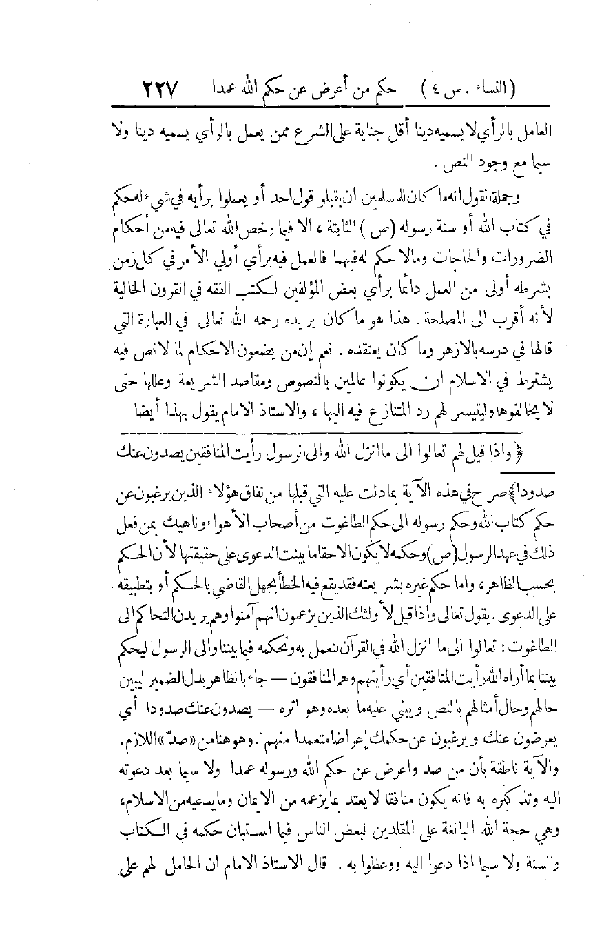 تَعْهَدُ إِلَيْهِمُ الْأُمَّةُ وَضَعَهُ مِنَ الْأَحْكَامِ السِّيَاسِيَّةِ وَالْمَدَنِيَّةِ الَّتِي مَسَّتْ حَاجَتُهَا إِلَيْهَا لِثِقَتِهَا بِهِمْ لَا تَقْدِيسًا لِذَوَاتِهِمْ، وَمَا يَضَعُونَهُ بِشُرُوطِهِ الَّتِي بَيَّنَّاهَا فِي تَفْسِيرِ تِلْكَ الْآيَاتِ يُنْسَبُ إِلَى الْأُمَّةِ لِأَنَّهُمْ وَضَعُوهُ بِالنِّيَابَةِ عَنْهَا، فَلَا يَشْعُرُ أَحَدُ مُتَّبِعِيهِ بِأَنَّهُ صَارَ مُسْتَعْبَدًا مُسْتَذَلًّا لِأَحَدِ أُولَئِكَ النُّوَّابِ عَنْهُ لِمَا ذَكَرْنَاهُ، وَلِأَنَّ رَأْيَ كُلِّ وَاحِدٍ مِنْهُمْ، وَقَدْ وَضَعُوا مَا وَضَعُوهُ بِالْمُشَاوَرَةِ، يَكُونُ مُدْغَمًا فِي آرَاءِ الْآخَرِينَ، وَالسُّلْطَةُ فِي ذَلِكَ لِلْأُمَّةِ فِي مَجْمُوعِهَا لَا لِأُولَئِكَ الْأَفْرَادِ الَّذِينَ وَكَّلَتْ إِلَيْهِمْ ذَلِكَ، عَلَى أَنَّ الرَّجُلَ يَكِلُّ إِلَى آخَرَ أَنْ يَنُوبَ عَنْهُ فِي الْأَمْرِ أَوْ يُوَكِّلَهُ فِيهِ فَيَقُومَ بِذَلِكَ، وَلَا يَرَى الْعَاهِدُ أَوِ الْمُوَكَّلُ أَنَّهُ صَارَ مُسْتَذَلًّا لَهُ، وَلَا يَرَى النَّاسُ ذَلِكَ أَيْضًا بَلْ قَدْ يَرَوْنَ عَكْسَهُ، فَالْمُؤْمِنُ لَا يَذِلُّ وَيَسْتَخْذِي لِأَحَدٍ مِنْ خَلْقِ اللهِ لِذَاتِهِ بَلْ لِلَّهِ وَحْدَهُ، وَالْعِزَّةُ لِلَّهِ وَلِرَسُولِهِ وَلِلْمُؤْمِنِينَ، كَمَا أَثْبَتَ الْكِتَابُ الْمُبِينُ.
