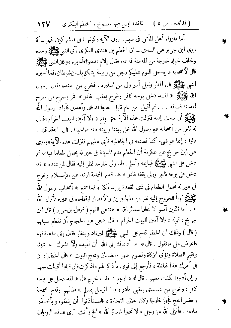 ثُمَّ قَالَ تَعَالَى: ذَلِكُمْ فِسْقٌ. ذَهَبَ ابْنُ جَرِيرٍ فِي تَفْسِيرِهِ إِلَى أَنَّ الْإِشَارَةَ هُنَا رَاجِعَةٌ إِلَى جَمِيعِ مَا سَبَقَ مِنَ الْمُحَرَّمَاتِ، أَيْ كُلُّ مُحَرَّمٍ مِنْهَا خُرُوجٌ مِنْ طَاعَةِ اللهِ، وَرَغْبَةٌ عَنْ شَرْعِهِ، وَذَكَرَ الرَّازِيُّ فِيهِ وَجْهًا آخَرَ، وَهُوَ أَنَّهُ رَاجِعٌ إِلَى الْأَخِيرِ فَقَطْ، وَهُوَ الِاسْتِقْسَامُ بِالْأَزْلَامِ.