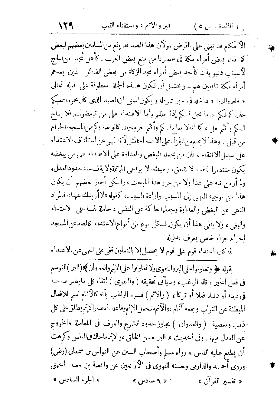 الْيَوْمِ، وَذَكَرَ مَا رَوَاهُ قَبْلَ ذَلِكَ عَنِ ابْنِ عَبَّاسٍ، وَالسُّدِّيِّ مِنْ تَفْسِيرِ الْإِكْمَالِ بِإِكْمَالِ الْفَرَائِضِ وَالْأَحْكَامِ، وَمَا يُعَارِضُهُ مِنْ قَوْلِ الْبَرَاءِ بْنِ عَازِبٍ، فِي آيَةِ يَسْتَفْتُونَكَ قُلِ اللهُ يُفْتِيكُمْ فِي الْكَلَالَةِ إِنَّهَا آخَرُ آيَةٍ نَزَلَتْ، وَنَقُولُ: لَا مُعَارَضَةَ فَإِنَّ مُرَادَهُ أَنَّهَا آخِرُ آيَاتِ الْفَرَائِضِ، وَهَذَا لَا يَنْفِي أَنْ تَكُونَ نَزَلَتْ قَبْلَ آيَةِ الْمَائِدَةِ وَسُورَةِ الْمَائِدَةِ، وَاسْتَدَلَّ عَلَى التَّرْجِيحِ أَيْضًا بِاتِّفَاقِ الْعُلَمَاءِ عَلَى أَنَّ الْوَحْيَ لَمْ يَنْقَطِعْ عَنْ رَسُولِ اللهِ - صَلَّى اللَّهُ عَلَيْهِ وَسَلَّمَ - إِلَى أَنْ قُبِضَ، وَكَوْنِهِ كَانَ قَبْلَ وَفَاتِهِ أَكْثَرَ مَا كَانَ تَتَابُعًا، وَجَعَلَ مِنْهُ آيَةَ الْفَتْوَى فِي الْكَلَالَةِ، وَأَصْحَابُ الْقَوْلِ الْآخَرِ يَمْنَعُونَ أَنْ تَكُونَ هَذِهِ الْآيَةُ مِمَّا نَزَلَ بَعْدَ آيَةِ الْمَائِدَةِ، وَلَا يَمْنَعُونَ غَيْرَهَا مِمَّا لَيْسَ فِيهِ فَرَائِضُ وَلَا حَلَالٌ وَلَا حَرَامٌ، وَبِهَذَا يُبْطِلُ تَرْجِيحُهُ إِثْبَاتَ نُزُولِ شَيْءٍ مِنَ الْأَحْكَامِ عَلَى نَفْيِهِ بِتَقْدِيمِ الْمُثْبِتِ عَلَى النَّافِي.