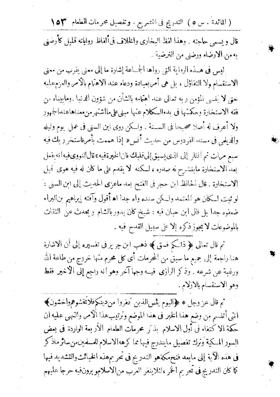 وَأَنْفُسِهِنَّ، لَا الْفُجُورَ الْمُرَادُ بِهِ سَفْحُ الْمَاءِ جَهْرًا وَلَا سِرًّا، وَسَيَأْتِي بَيَانُ مَا هُوَ الِاحْتِيَاطُ وَبَحْثُ اخْتِلَافِ الزَّمَانِ فِي الْمَسْأَلَةِ. وَالتَّعْبِيرُ بِقَوْلِهِ الْيَوْمَ أُحِلَّ لَكُمُ الطَّيِّبَاتُ إِنْشَاءٌ لِحِلِّهَا الْعَامِّ الدَّائِمِ كَمَا تَقَدَّمَ، وَلَكِنَّهُ لَمْ يَقُلْ مِثْلَ ذَلِكَ فِيمَا بَعْدَهُ بَلْ قَالَ: حِلٌّ لَكُمْ وَهُوَ خَبَرٌ مُقَرِّرٌ لِلْأَصْلِ فِي الْمَسْأَلَتَيْنِ: مَسْأَلَةُ مُؤَاكَلَةِ أَهْلِ الْكِتَابِ، وَمَسْأَلَةُ نِكَاحِ نِسَائِهِمْ، فَلَمْ يَكُنْ شَيْءٌ مِنْهُمَا مُحَرَّمًا مِنْ قَبْلُ وَأُحِلَّ فِي ذَلِكَ الْيَوْمِ، لَا بِتَحْرِيمٍ مِنَ اللهِ وَلَا بِتَحْرِيمِ النَّاسِ عَلَى أَنْفُسِهِمْ ; كَمَا حَرَّمُوا بَعْضَ الطَّيِّبَاتِ. فَهَذَا مَا ظَهَرَ لَنَا مِنْ نُكْتَةِ اخْتِلَافِ التَّعْبِيرِ، وَسَكَتَ عَنْهُ الْبَاحِثُونَ فِي نُكَتِ الْبَلَاغَةِ الَّذِينَ اطَّلَعْنَا عَلَى كَلَامِهِمْ، وَحِكْمَةُ النَّصِّ عَلَى هَذَا الْحِلِّ قَطْعُ الطَّرِيقِ عَلَى الْغُلَاةِ أَنْ يُحَرِّمُوهُ بِاجْتِهَادِهِمْ وَأَهْوَائِهِمْ، عَلَى أَنَّ مِنْهُمْ مَنْ حَرَّمَهُ مَعَ النَّصِّ الصَّرِيحِ، وَنَصَّ عَلَى أَنَّ طَعَامَنَا حِلٌّ لَهُمْ دُونَ نِسَائِنَا، فَلَيْسَ لَنَا أَنْ نُزَوِّجَهُمْ مِنَّا ; لِأَنَّ كَمَالَ الْإِسْلَامِ وَسَمَاحَتَهُ لَا يَظْهَرَانِ مِنَ الْمَرْأَةِ؛ لِسُلْطَانِ الرَّجُلِ عَلَيْهَا، هَذَا هُوَ الْمُتَبَادِرُ لِمَنْ يَفْهَمُ الْعِبَارَةَ مُجَرَّدًا مِنْ تَقَالِيدِ الْمَذَاهِبِ، فَمَنْ فَهِمَ مِثْلَ فَهْمِنَا، فَفَهْمُهُ حَاكِمٌ عَلَيْهِ، وَلَا نُجِيزُ لِأَحَدٍ أَنْ يُقَلِّدَنَا فِيهِ تَقْلِيدًا.