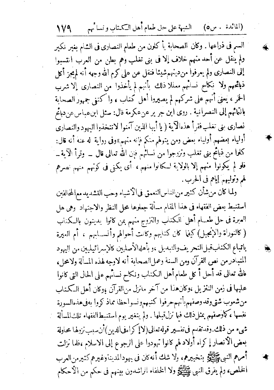 وَالْأَمْرُ كَمَا قَالَ الْقَاضِي، رَحِمَهُ اللهُ تَعَالَى. وَمُرَادُهُ بِذَبَائِحِهِمْ مُذَكَّاهُمْ كَيْفَمَا كَانَتْ تَذْكِيَتُهُ عِنْدَهُمْ، وَقَدْ تَقَدَّمَ تَحْقِيقُ مَعْنَى التَّذْكِيَةِ وَأَنَّهَا عِبَارَةٌ عَنْ قَتْلِ الْحَيَوَانِ بِقَصْدِ أَكْلِهِ، وَأَقْوَالُ عُلَمَاءِ السَّلَفِ وَمُحَقِّقِي الْمَالِكِيَّةِ فِي ذَلِكَ، فَلِلَّهِ دَرُّ مَالِكٍ وَالْمَالِكِيَّةِ، إِنَّ كَلَامَهُمْ فِي هَذِهِ الْمَسْأَلَةِ أَظْهَرُ مِنْ كَلَامِ مُخَالِفِيهِمْ دَلِيلًا، وَأَلْيَقُ بِيُسْرِ الْحَنِيفِيَّةِ السَّمْحَةِ. وَمِنَ الْعَجَائِبِ أَنَّ كَثِيرًا مِنَ النَّاسِ يُحِبُّونَ أَنْ تَكُونَ الشَّرِيعَةُ عُسْرًا لَا يُسْرًا وَحَرَجًا لَا سِعَةً، وَإِنْ هُمْ لَمْ يَلْتَزِمُوهَا إِلَّا فِيمَا يُوَافِقُ أَهْوَاءَهُمْ، فَمَنْ شَدَّدَ عَلَى نَفْسِهِ فَذَاكَ ذَنْبٌ عِقَابُهُ فِيهِ، وَمَنْ شَدَّدَ عَلَى الْأُمَّةِ حَثَوْنَا التُّرَابَ فِي فِيهِ، وَاللهُ أَعْلَمُ وَأَحْكَمُ.