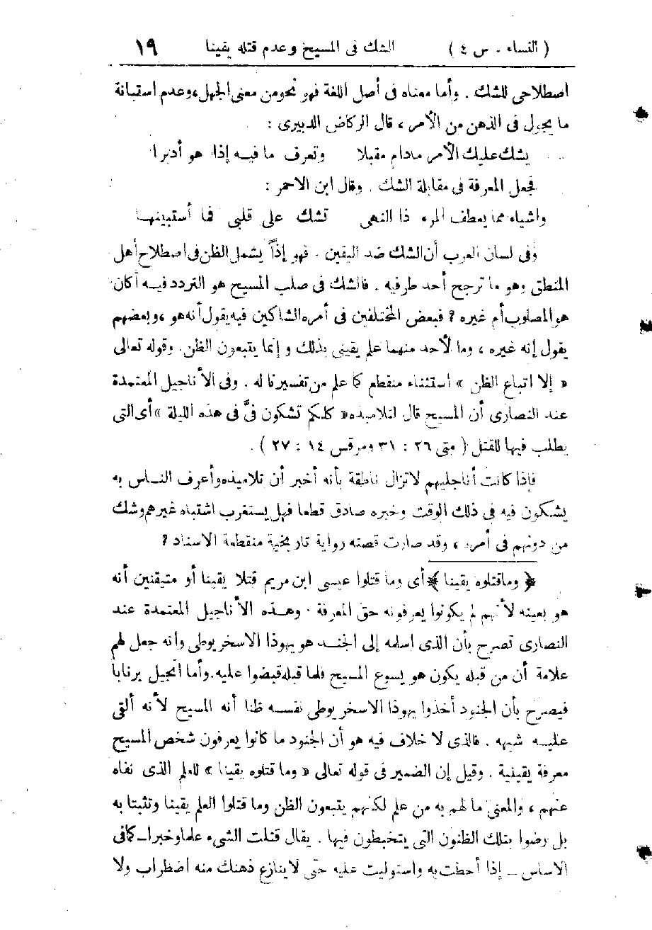 أَحَدٍ مِنْ أَهْلِ الْكِتَابِ يُؤْمِنُ بِعِيسَى قَبْلَ مَوْتِ عِيسَى، وَهَذَا مَبْنِيٌّ عَلَى الْقَوْلِ بِأَنَّ عِيسَى لَمَّا يَمُتْ، وَأَنَّهُ رُفِعَ إِلَى السَّمَاءِ قَبْلَ وَفَاتِهِ، وَهُمُ الَّذِينَ أَوَّلُوا قَوْلَهَ تَعَالَى: إِنِّي مُتَوَفِّيكَ وَرَافِعُكَ إِلَيَّ (3: 55) وَهُمْ عَلَى هَذَا يَحْتَاجُونَ إِلَى تَأْوِيلِ النَّفْيِ الْعَامِّ هُنَا بِتَخْصِيصِهِ بِمَنْ يَكُونُ مِنْهُمْ حَيًّا عِنْدَ نُزُولِهِ، فَيَقُولُونَ: الْمَعْنَى: وَمَا مِنْ أَحَدٍ مِنْ أَهْلِ الْكِتَابِ الَّذِينَ يَنْزِلُ الْمَسِيحُ مِنَ السَّمَاءِ إِلَى الْأَرْضِ وَهُمْ أَحْيَاءٌ، إِلَّا لَيُؤْمِنَنَّ بِهِ، وَيَتْبَعَنَّهُ، وَالْمُتَبَادِرُ مِنَ الْآيَةِ الْمَعْنَى الْأَوَّلُ، وَهَذَا التَّخْصِيصُ لَا دَلِيلَ عَلَيْهِ، وَهُوَ مَبْنِيٌّ عَلَى شَيْءٍ لَا نَصَّ عَلَيْهِ فِي الْقُرْآنِ حَتَّى يَكُونَ قَرِينَةً لَهُ، وَالْأَخْبَارُ الَّتِي وَرَدَتْ فِيهِ لَمْ تَرِدْ مُفَسِّرَةً لِلْآيَةِ.