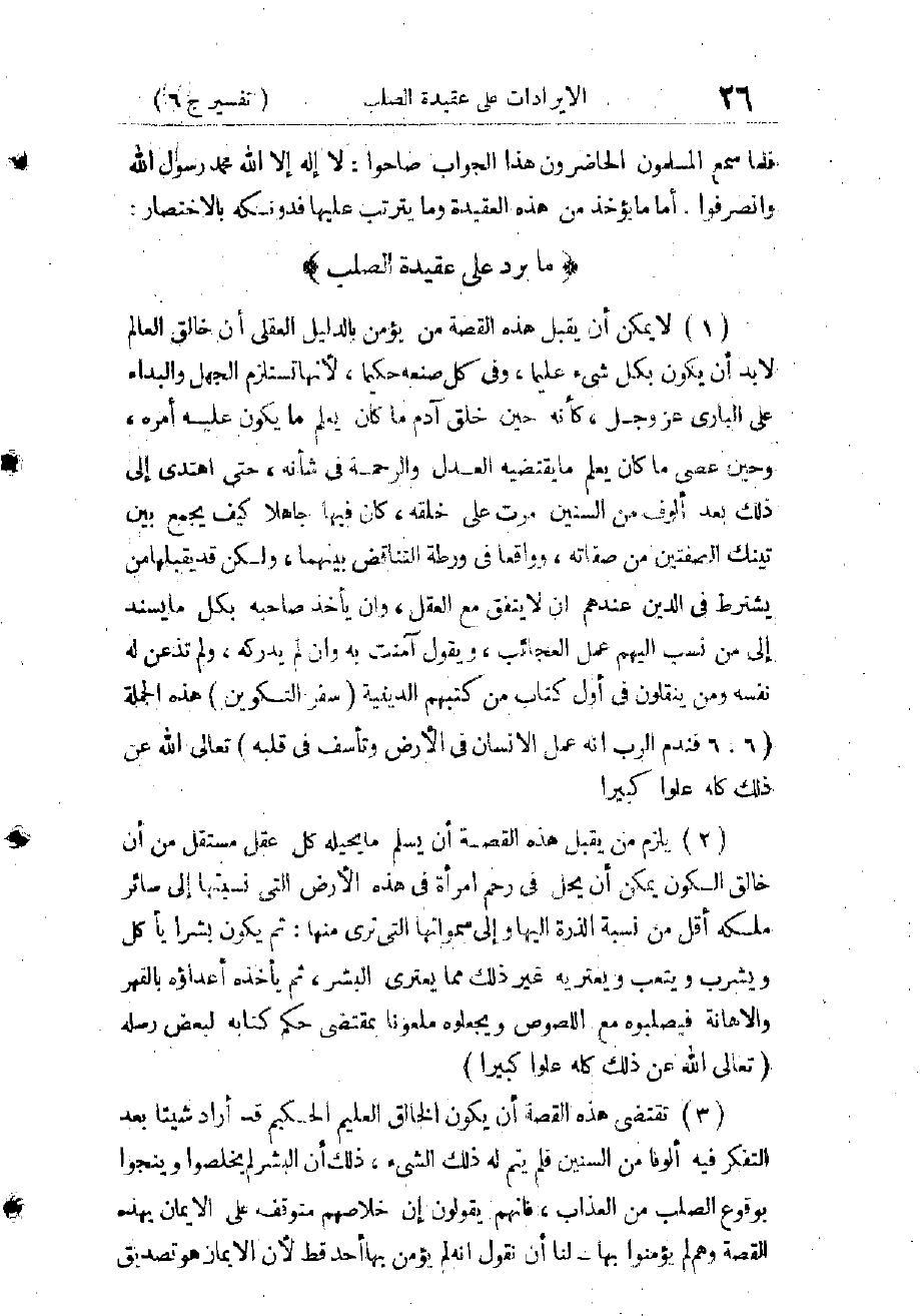 أَلَيْسَتْ هَذِهِ التَّعَالِيمُ الْإِسْلَامِيَّةُ هِيَ الَّتِي تَرْفَعُ قَدْرَ الْإِنْسَانِ، وَتُعْلِي هِمَّتَهُ، وَتَحْفِزُهُ إِلَى طَلَبِ الْكَمَالِ بِإِيمَانِهِ وَإِخْلَاصِهِ وَأَعْمَالِهِ الصَّالِحَةِ؟ أَلَيْسَتْ أَفْضَلَ وَأَنْفَعَ مِنْ الِاتِّكَالِ عَلَى تِلْكَ الْقِصَّةِ الصَّلِيبِيَّةِ الْمَأْثُورِ مِثْلُهَا عَنْ خُرَافَاتِ الْوَثَنِيِّينَ؟ الَّتِي لَا يُصَدِّقُهَا عَقْلٌ مُسْتَقِلٌّ، وَلَا يَطْمَئِنُّ بِهَا قَلْبٌ سَلِيمٌ، الْمُخَالِفَةِ لِسُنَنِ الْفِطْرَةِ وَنِظَامِ الْخِلْقَةِ، الَّتِي أَفْسَدَتِ الْعُقُولَ وَالْأَخْلَاقَ فِي الْمَمَالِكِ الصَّلِيبِيَّةِ مُنْذُ شَاعَتْ فِيهَا بِنُفُوذِ الْمَلِكِ قُسْطَنْطِينَ الصَّلِيبِيِّ، إِلَى أَنْ عَتَقَتْ أُورُبَّةُ مِنْ رِقِّ الْكَنِيسَةِ، بِنُورِ الْعِلْمِ وَالِاسْتِقْلَالِ اللَّذَيْنِ أَشْرَقَا عَلَيْهَا مِنْ بِلَادِ الْإِسْلَامِ. (وَلَكِنْ وَاأَسَفَا عَلَى ذَلِكَ النُّورِ الَّذِي ضُرِبَ بَيْنَهُ وَبَيْنَ أَهْلِهِ بِسُورٍ لَهُ بَابٌ، ظَاهِرُهُ فِيهِ الرَّحْمَةُ وَبَاطِنُهُ مِنْ قِبَلِهِ الْعَذَابُ، وَوَاشَوْقَاهُ إِلَى الْيَوْمِ الَّذِي يَنْدَكُّ فِيهِ هَذَا السُّورُ الَّذِي حَجَبَهُمْ عَنِ الْقُرْآنِ) .