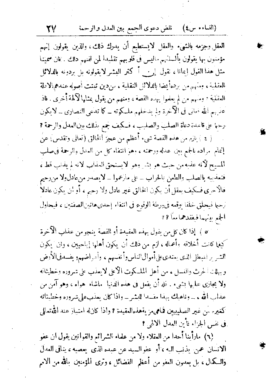 (عَقِيدَةُ الصَّلْبِ وَالْفِدَاءِ وَثَنِيَّةٌ) اعْتَرَفَ أَمَامَنَا كَثِيرٌ مِنَ الَّذِينَ قَالُوا: إِنَّهُمْ نَصَارَى، بِأَنَّ كُلًّا مِنْ هَذِهِ الْعَقِيدَةِ، وَعَقِيدَةِ التَّثْلِيثِ لَا تُعْقَلُ، وَأَنَّ الْعُمْدَةَ عِنْدَهُمُ النَّقْلُ عَنْ كُتُبِهِمُ الْمُقَدَّسَةِ، فَلَمَّا كَانَتْ تِلْكَ الْكُتُبُ ثَابِتَةً عِنْدَهُمْ وَجَبَ أَنْ يَقْبَلُوا جَمِيعَ مَا فِيهَا، سَوَاءٌ عُقِلَ أَمْ لَمْ يُعْقَلْ، وَيَقُولُ بَعْضُهُمْ: إِنَّ كُلَّ دِينٍ مِنَ الْأَدْيَانِ فِيهِ عَقَائِدُ وَأَخْبَارٌ يَجْزِمُ الْعَقْلُ بِاسْتِحَالَتِهَا، وَلَكِنَّهَا تُؤْخَذُ بِالتَّسْلِيمِ.