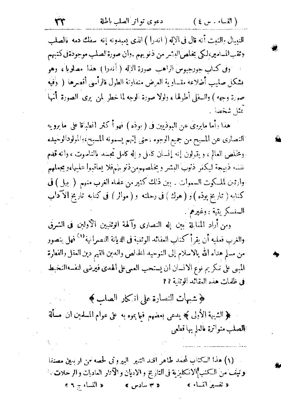 عِيسَى ابْنَ مَرْيَمَ، وَأَنْقَذَهُ مِنْ أَعْدَائِهِ، فَأَلْقَى شَبَهَهُ عَلَى غَيْرِهِ، وَغَيَّرَ شَكْلَهُ هُوَ، فَخَرَجَ مِنْ بَيْنِهِمْ وَهُمْ لَا يَشْعُرُونَ. وَفِي أَنَاجِيلِهِمْ وَكُتُبِهِمْ جُمَلٌ مُتَفَرِّقَةٌ تُؤَيِّدُ هَذَا الْوَجْهَ أَشَرْنَا إِلَى بَعْضِهَا مِنْ قَبْلُ (مِنْهَا) قَوْلُهُ لَهُمْ: إِنَّهُمْ يَشُكُّونَ فِيهِ يَوْمَئِذٍ (وَمِنْهَا) : أَنَّهُ يَتَشَكَّلُ بِغَيْرِ شَكْلِهِ (وَمِنْهَا) : أَنَّهُ طَلَبَ مِنَ اللهِ أَنْ يَعْبُرَ عَنْهُ هَذِهِ الْكَأْسَ أَيْ قَتْلَهُ وَصَلْبَهُ إِنْ أَمْكَنَ. وَلَا شَكَّ أَنَّ هَذَا مِنَ الْمُمْكِنَاتِ الْخَاضِعَةِ لِمَشِيئَةِ اللهِ وَقُدْرَتِهِ.