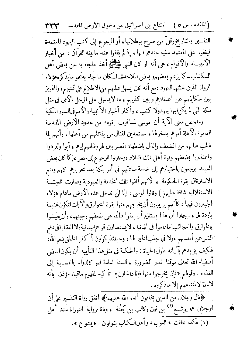 وَإِذَا رَجَعْنَا إِلَى الْمَأْثُورِ فِي تَفْسِيرِ الْآيَاتِ نَرَاهُمْ نَقَلُوا عَنِ ابْنِ عَبَّاسٍ رَضِيَ اللهُ عَنْهُ أَقْوَالًا، مِنْهَا قَوْلُهُ: كُفْرٌ دُونَ كُفْرٍ، وَظُلْمٌ دُونَ ظُلْمٍ، وَفِسْقٌ دُونَ فِسْقٍ، وَمِنْهَا أَنَّ الْآيَاتِ الثَّلَاثَ فِي الْيَهُودِ خَاصَّةً، لَيْسَ فِي أَهْلِ الْإِسْلَامِ مِنْهَا شَيْءٌ، وَرُوِيَ عَنِ الشَّعْبِيِّ أَنَّ الْأُولَى وَالثَّانِيَةَ فِي الْيَهُودِ، وَالثَّالِثَةَ فِي النَّصَارَى، وَهَذَا هُوَ الظَّاهِرُ، وَلَكِنَّهُ لَا يَنْفِي أَنْ يَنَالَ هَذَا الْوَعِيدُ كُلَّ مَنْ كَانَ مِنَّا مِثْلَهُمْ، وَأَعْرَضَ عَنْ كِتَابِهِ إِعْرَاضَهُمْ عَنْ كُتُبِهِمْ، وَالْقُرْآنُ عِبْرَةٌ يَعْبُرُ بِهِ الْعَقْلُ مِنْ فَهْمِ الشَّيْءِ إِلَى مِثْلِهِ. وَقَدْ ذُكِرَتْ هَذِهِ الْآيَاتُ عِنْدَ حُذَيْفَةَ بْنِ الْيَمَانِ، فَقَالَ رَجُلٌ: إِنَّ هَذَا فِي بَنِي إِسْرَائِيلَ. قَالَ حُذَيْفَةُ: نِعْمَ الْإِخْوَةُ لَكُمْ بَنُو إِسْرَائِيلَ ; أَنْ كَانَ لَكُمْ كُلُّ حُلْوَةٍ وَلَهُمْ كُلُّ مُرَّةٍ، كَلَّا وَاللهِ لَتَسْلُكُنَّ طَرِيقَهُمْ قَدَّ الشِّرَاكِ (أَيْ سَيْرَ النَّعْلِ) عَزَاهُ فِي الدُّرِّ الْمَنْثُورِ إِلَى عَبْدِ الرَّزَّاقِ، وَابْنِ جَرِيرٍ، وَابْنِ أَبِي حَاتِمٍ، وَالْحَاكِمِ، وَصَحَّحَهُ.