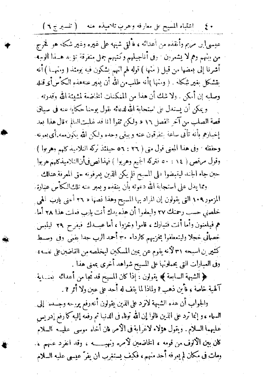 يُصَدِّقُ بَعْضًا. بَلْ يَتَّهِمُ بَعْضُهُمْ بَعْضًا بِالْكَذِبِ وَالْهَذَيَانِ، وَأَنَّهُمْ لِضَعْفِهِمْ تَرَكُوا نَبِيَّهُمْ وَقْتَ الشِّدَّةِ، وَأَنْكَرَهُ أَمْثَلُهُمْ، وَارْتَشَى عَلَيْهِ بَعْضُهُمْ. فَأَمْثَالُ هَؤُلَاءِ الصَّيَّادِينَ وَالنِّسَاءِ، لَا يُسْتَغْرَبُ مِنْهُمْ عَدَمُ التَّمْيِيزِ بَيْنَ الْحَقِيقَةِ وَالْخَيَالِ، وَطَالَمَا وَقَعَ مِثْلُ ذَلِكَ فِي حَالِ الِانْفِعَالَاتِ الْعَصَبِيَّةِ لِلنَّاسِ، كَالْحُزْنِ وَالْخَوْفِ وَالْعِشْقِ، يَتَرَاءَى لِلْإِنْسَانِ فِي مِثْلِ هَذِهِ الْأَحْوَالِ شَخْصٌ يُكَلِّمُهُ زَمَنًا طَوِيلًا أَوْ قَصِيرًا كَمَا يَحْصُلُ فِي الرُّؤَى وَالْأَحْلَامِ. وَبَعْضُهُمْ يَعُدُّ هَذَا مِنْ رُؤْيَةِ الْأَرْوَاحِ، وَقَدْ رَاجَتْ سُوقُ هَذِهِ الْمَسْأَلَةِ فِي أُورُبَّةَ فِي هَذَا الْعَصْرِ حَتَّى صَارُوا يَزْعُمُونَ أَنَّ فِيهِمْ مَنْ يَسْتَحْضِرُ الرُّوحَ، وَكَانَ هَذَا مَعْرُوفًا فِي الزَّمَنِ السَّابِقِ ; وَلِذَلِكَ احْتَرَسَ عَنْهُ بَعْضُ مُؤَلِّفِي هَذِهِ الْأَنَاجِيلِ، فَقَالَ: إِنَّهُ لَمَّا ظَهَرَ لَهُمْ خَافُوا وَظَنُّوا أَنَّهُمْ يَرَوْنَ رُوحًا، فَنَفَى هُوَ ذَلِكَ.