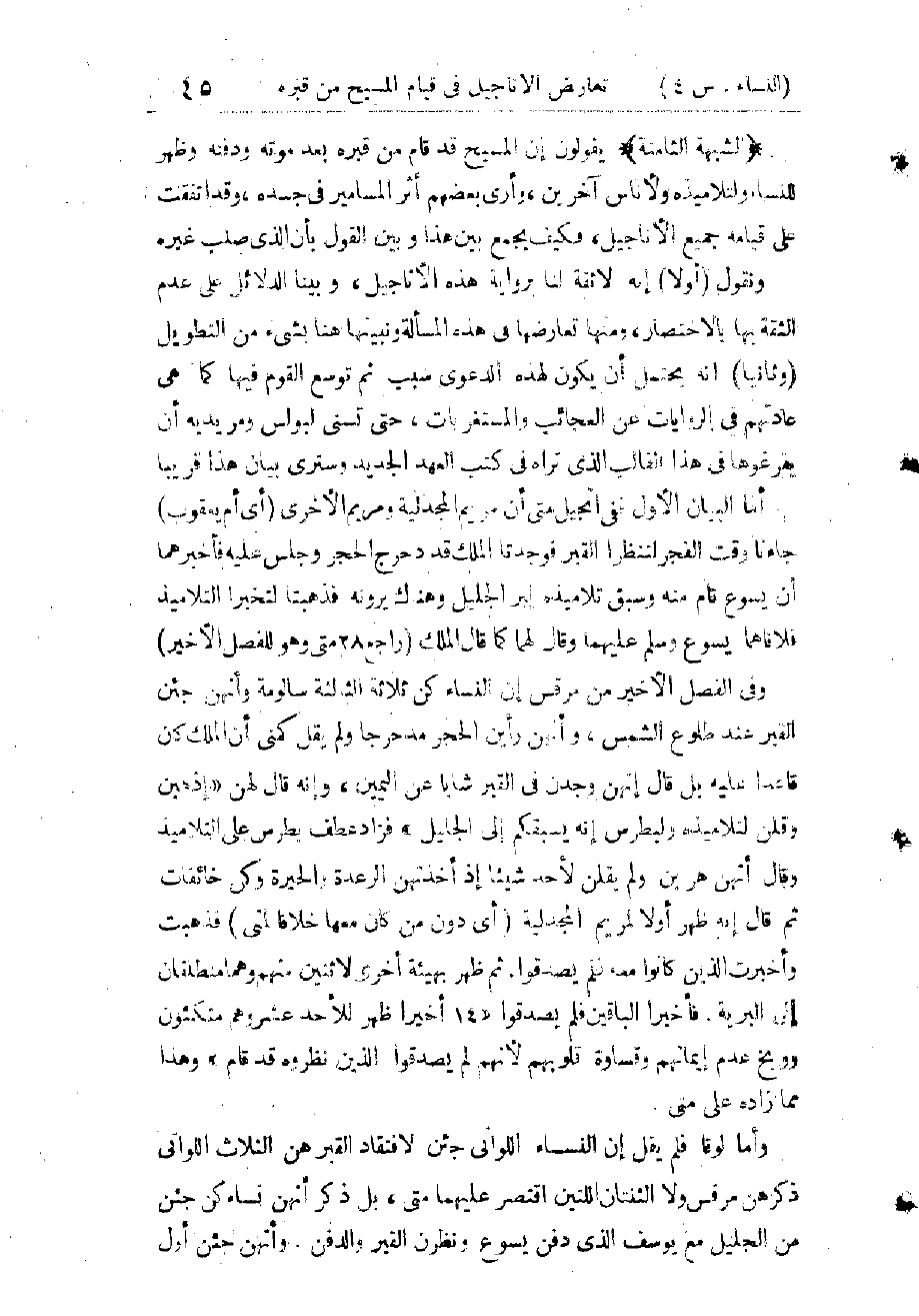 السَّلَامُ - مِرَارًا وَتَلَقَّى عَنْهُمَا، وَمِنْ ذَلِكَ أَنَّهُ سَأَلَ مَرْيَمَ عَنْ تَمَثُّلِ الْمَلَكِ لَهَا وَنَفْخِهِ فِيهَا، فَأَجَابَتْهُ عَنْ ذَلِكَ، وَأَنَّهُ حَصَلَ مِنْ ذَلِكَ نَحْوُ مَا يَحْصُلُ بِالزَّوَاجِ مِنَ التَّلْقِيحِ، وَسَأَلْتُهُ أَنَا عَنِ اسْتِحْضَارِ الْأَرْوَاحِ الَّذِي نَسْمَعُهُ عَنِ الْإِفْرِنْجِ، هَلْ هُوَ مِثْلُ مَا يَذْكُرُهُ عَنْ نَفْسِهِ، وَيُؤْثَرُ عَنِ الصُّوفِيَّةِ مِنْ قَبْلِهِ؟ فَقَالَ: إِنَّ بَعْضَهُ حِيَلٌ، وَبَعْضَهُ لَهُ أَصْلٌ دُونَ مَا عِنْدَنَا وَأَبْعَدُ عَنْهُ بِمَرَاحِلَ. وَأَنَا لَا أَتَّهِمُ هَذَا الرَّجُلَ بِالْكَذِبِ عَنْ نَفْسِهِ، وَلَا أَتَّهِمُ الْإِمَامَ الْغَزَالِيَّ فِيمَا رَوَاهُ عَنْ نَفْسِهِ مِنْ مِثْلِ ذَلِكَ أَيْضًا، وَإِنَّمَا أَقُولُ إِذَا كَانَتْ هَذِهِ الرُّؤْيَةُ خَيَالِيَّةً أَيْضًا كَرُؤْيَةِ الشَّيْخِ رَاغِبٍ فَهِيَ تُؤَكِّدُ مَا نَحْنُ فِيهِ مِنْ جَوَازِ مِثْلِ ذَلِكَ عَلَى جَمَاعَةِ الْمَسِيحِ، وَإِنْ كَانَتْ حَقِيقِيَّةً - وَهِيَ وَلَا شَكَّ أَعْلَى وَأَكْمَلُ مِمَّا يُثْبِتُهُ الْكَثِيرُونَ مِنْ عُلَمَاءِ الْإِفْرِنْجِ - فَهِيَ مُصَدِّقَةٌ لِخَبَرِ الْقُرْآنِ فِي قِصَّةِ الْمَسِيحِ وَنَاقِضَةٌ لِتِلْكَ الْعَقِيدَةِ الْخَيَالِيَّةِ، الْمُقَرَّرِ مِثْلُهَا عِنْدَ الْأُمَمِ الْوَثَنِيَّةِ.