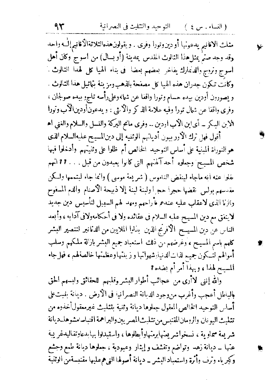 يَلِي ذَلِكَ مُحَاجَّةُ أَهْلِ الْكِتَابِ مِنَ الْيَهُودِ، مُمَهَّدًا لَهَا بِالْأَمْرِ بِعِبَادَةِ اللهِ وَحْدَهُ وَالنَّهْيِ عَنِ الشِّرْكِ، وَالْأَمْرِ بِالْإِحْسَانِ بِالْوَالِدَيْنِ وَالْأَقْرَبِينَ وَالْيَتَامَى وَالْمَسَاكِينِ وَالْجِيرَانِ، وَتَشْنِيعِ الْبُخْلِ وَكِتْمَانِ نِعَمِ اللهِ، وَوَعِيدِ الْكُفْرِ وَعِصْيَانِ الرَّسُولِ. وَذَلِكَ فِي بِضْعِ آيَاتٍ لَيْسَ فِيهَا مِنْ آيَاتِ الْأَحْكَامِ شَيْءٌ، إِلَّا مَا خُتِمَتْ بِهِ مِنْ آيَاتِ التَّيَمُّمِ الْمُفْتَتَحَةِ بِالنَّهْيِ عَنِ الصَّلَاةِ فِي حَالِ السُّكْرِ، ثُمَّ صَرَّحَ بَعْدَهَا بِحِكَايَةِ أَحْوَالِ الْيَهُودِ فِي دِينِهِمْ وَأَخْلَاقِهِمْ، وَبَيَّنَ مَا فِي ذَلِكَ مِنَ الْعِبَرِ، وَمَا يَسْتَحِقُّونَ عَلَيْهِ مِنَ الْوَعِيدِ ; لِيُعْلَمَ مِنْهُ سُنَّةُ اللهِ وَحُكْمُهُ فِيمَنْ يَعْمَلُ مِثْلَ عَمَلِهِمْ، وَتَكُونُ حَالُهُ كَحَالِهِمْ، كَمَا وَعَدَ مَنْ كَانَ عَلَى ضِدِّ ذَلِكَ ; وَهُوَ الْإِيمَانُ وَالصَّلَاحُ لِأَجْلِ الْعِبْرَةِ وَالْقُدْوَةِ، وَذَلِكَ مِنَ الْآيَةِ 44 إِلَى الْآيَةِ 57.
