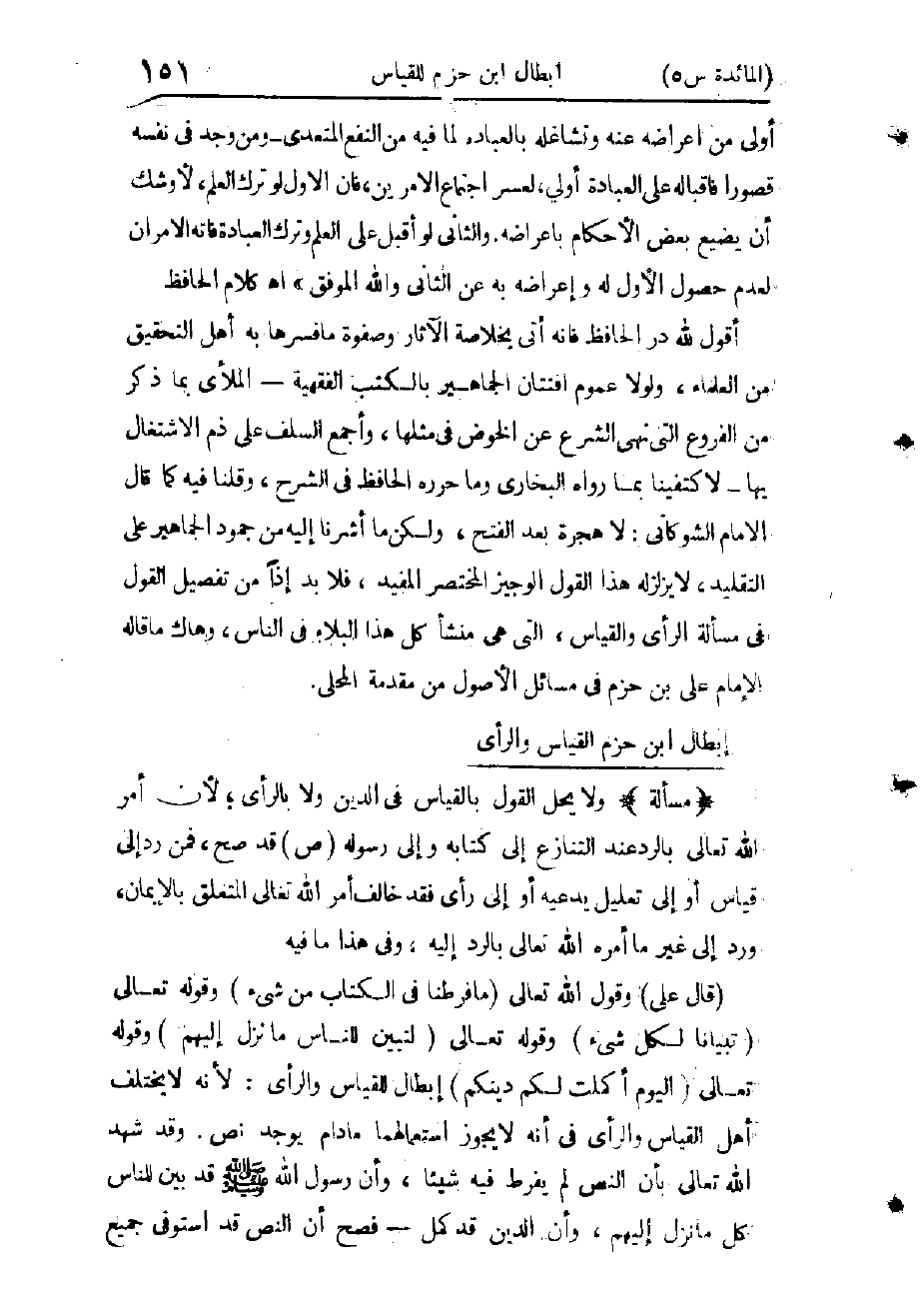 (2) بَيَّنَ أَنَّ الْحَدِيثَ نَصَّ عَلَى تَحْرِيمِ الرِّبَا فِي سِتَّةِ أَعْيَانٍ وَهِيَ الذَّهَبُ وَالْفِضَّةُ وَالْبُرُّ وَالشَّعِيرُ وَالتَّمْرُ وَالْمِلْحُ، ثُمَّ قَالَ: فَاتَّفَقَ النَّاسُ عَلَى تَحْرِيمِ التَّفَاضُلِ فِيهَا مَعَ اتِّحَادِ الْجِنْسِ أَيْ كَبَيْعِ الذَّهَبِ بِالذَّهَبِ وَالْقَمْحِ بِالْقَمْحِ، بِخِلَافِ بَيْعِ الذَّهَبِ بِالْفِضَّةِ، وَالْقَمْحِ بِالشَّعِيرِ مَثَلًا، فَإِنَّهُمْ جَوَّزُوهُ وَتَنَازَعُوا فِيمَا عَدَاهَا، فَطَائِفَةٌ قَصَرَتِ التَّحْرِيمَ عَلَيْهَا، وَأَقْدَمُ مَنْ يَرْوِي هَذَا عَنْ قَتَادَةَ، وَهُوَ مَذْهَبُ أَهْلِ الظَّاهِرِ، وَاخْتِيَارُ ابْنِ عَقِيلٍ (هُوَ مِنْ أَئِمَّةِ الْحَنَابِلَةِ) فِي آخِرِ مُصَنَّفَاتِهِ مَعَ قَوْلِهِ بِالْقِيَاسِ، قَالَ: لِأَنَّ عِلَلَ الْقِيَاسَيْنِ فِي مَسْأَلَةِ الرِّبَا ضَعِيفَةٌ، وَإِذَا لَمْ تَظْهَرْ فِيهِ عِلَّةٌ امْتَنَعَ الْقِيَاسُ.