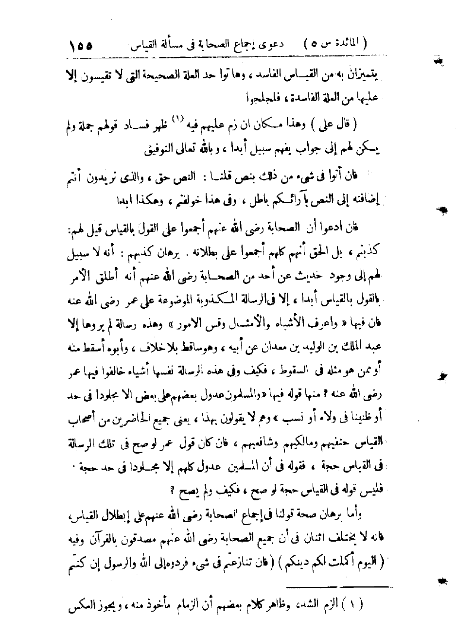 (الدَّلِيلُ الْخَامِسُ) : مَا اسْتَدَلَّ بِهِ ابْنُ سُرَيْجٍ، وَهُوَ قَوْلُهُ تَعَالَى: (يَسْتَحْيِي أَنْ يَضْرِبَ مَثَلًا مَا بَعُوضَةً فَمَا فَوْقَهَا) (2: 26) قَالَ: لِأَنَّ الْقِيَاسَ هُوَ تَشْبِيهُ الشَّيْءِ بِالشَّيْءِ، فَمَا جَازَ مِنْ فِعْلِ مَنْ لَا تَخْفَى عَلَيْهِ خَافِيَةٌ فَهُوَ مِمَّنْ لَا يَخْلُو مِنَ الْجَهَالَةِ وَالنَّقْصِ أَجْوَزُ. وَاعْتَمَدَ الشَّوْكَانِيُّ فِي رَدِّ هَذَا الِاسْتِدْلَالِ قَلْبَهُ عَلَى صَاحِبِهِ بِبَيَانِ أَنَّ مَنْ لَا تَخْفَى عَلَيْهِ خَافِيَةٌ، فَكُلُّ مَا يَضْرِبُهُ مِنْ مَثَلٍ وَمَا يُثْبِتُهُ مِنْ تَشْبِيهِ شَيْءٍ بِشَيْءٍ يَجِبُ أَنْ يَكُونَ صَحِيحًا، وَأَمَّا مَنْ لَا يَخْلُو مِنَ النَّقْصِ وَالْجَهْلِ فَلَا نَقْطَعُ بِصِحَّةِ ذَلِكَ مِنْهُ وَلَا نَظُنُّهُ لِمَا فِي فَاعِلِهِ مِنَ الْجَهَالَةِ وَالنَّقْصِ.